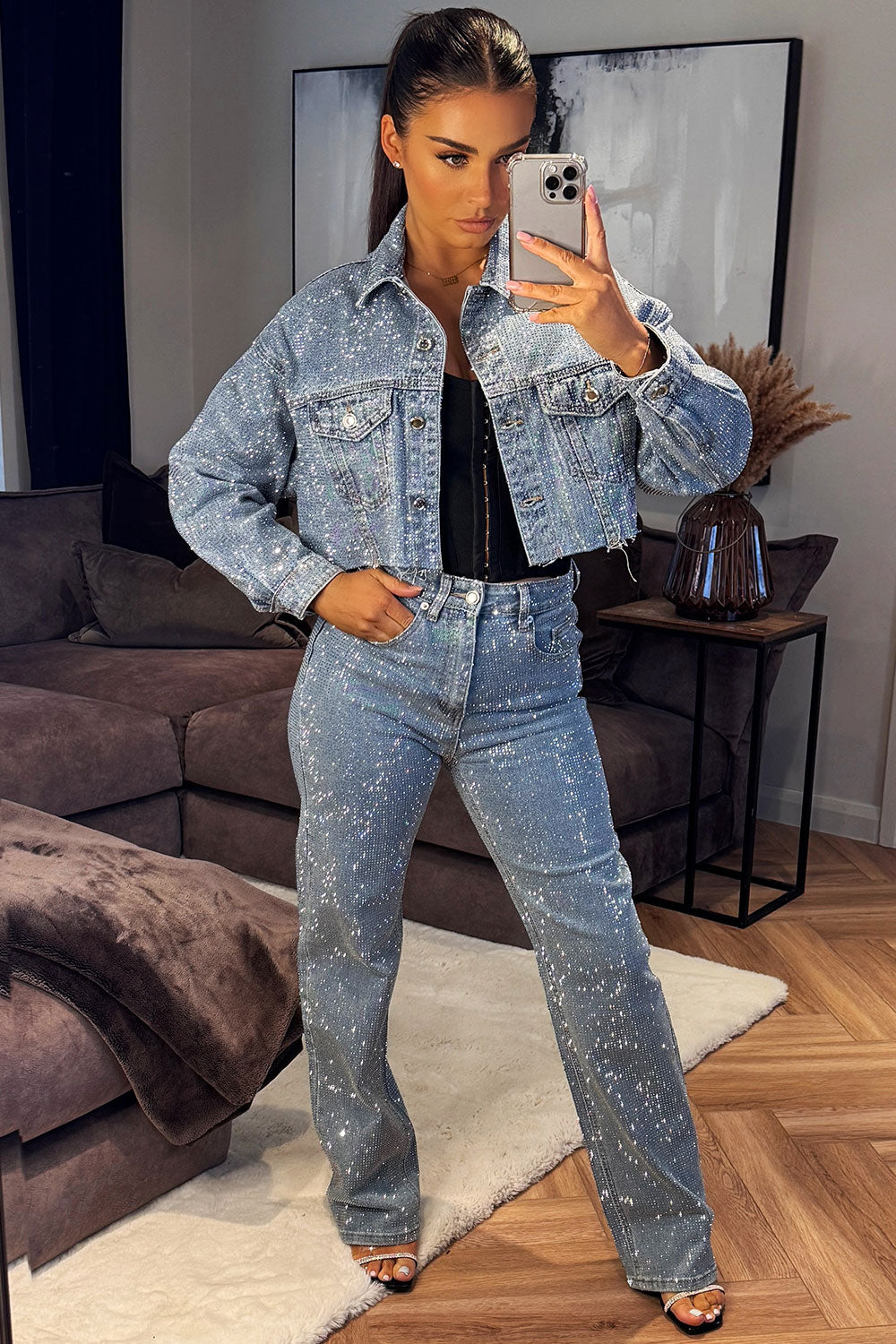 Diamante rhinestone crop denim jacket. This diamante crop denim jacket is the hottest trend right now babe. Featuring denim jacket crop length diamante rhinestone detail collar button fastening and premium quality. Style this rhinestone diamante denim jacket with matching outfit to get the look we are loving. This diamante rhinestone crop denim jacket is also available in other colours.