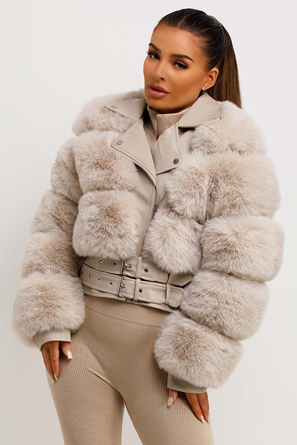 Faux Fur Faux Leather Aviator Jacket With Belt Beige