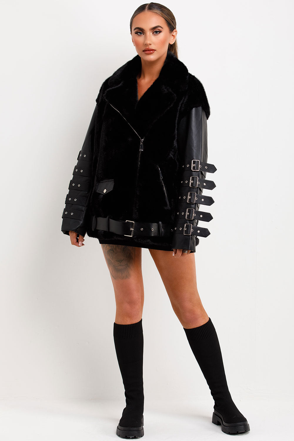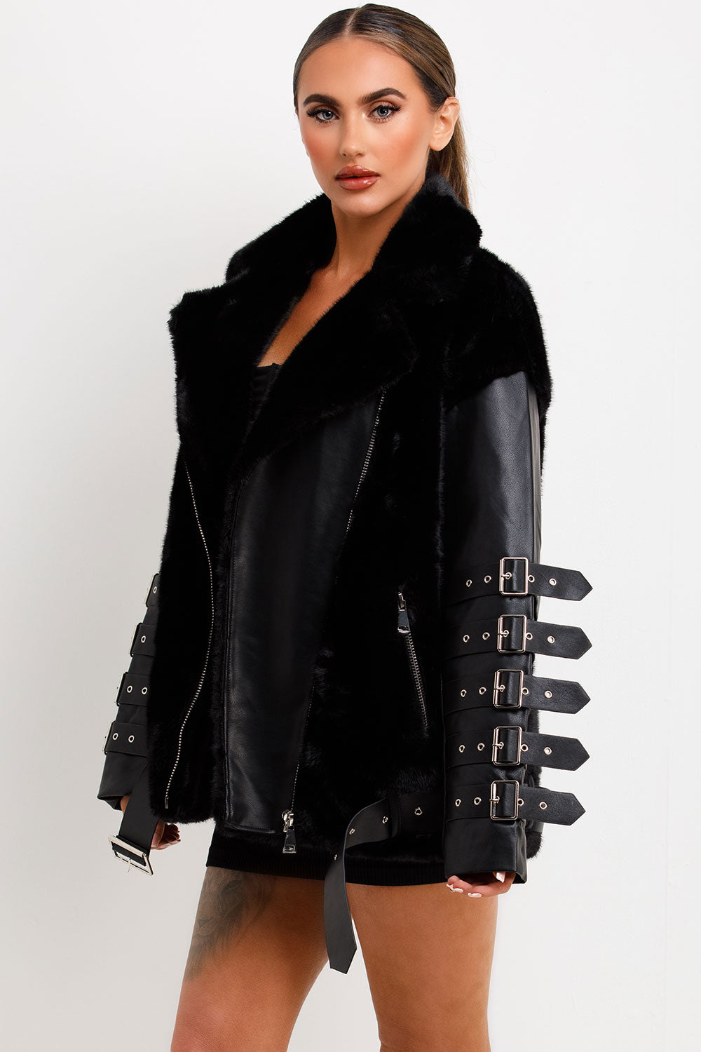 Faux Fur Faux Leather Aviator Jacket With Strap Sleeve Detail Black