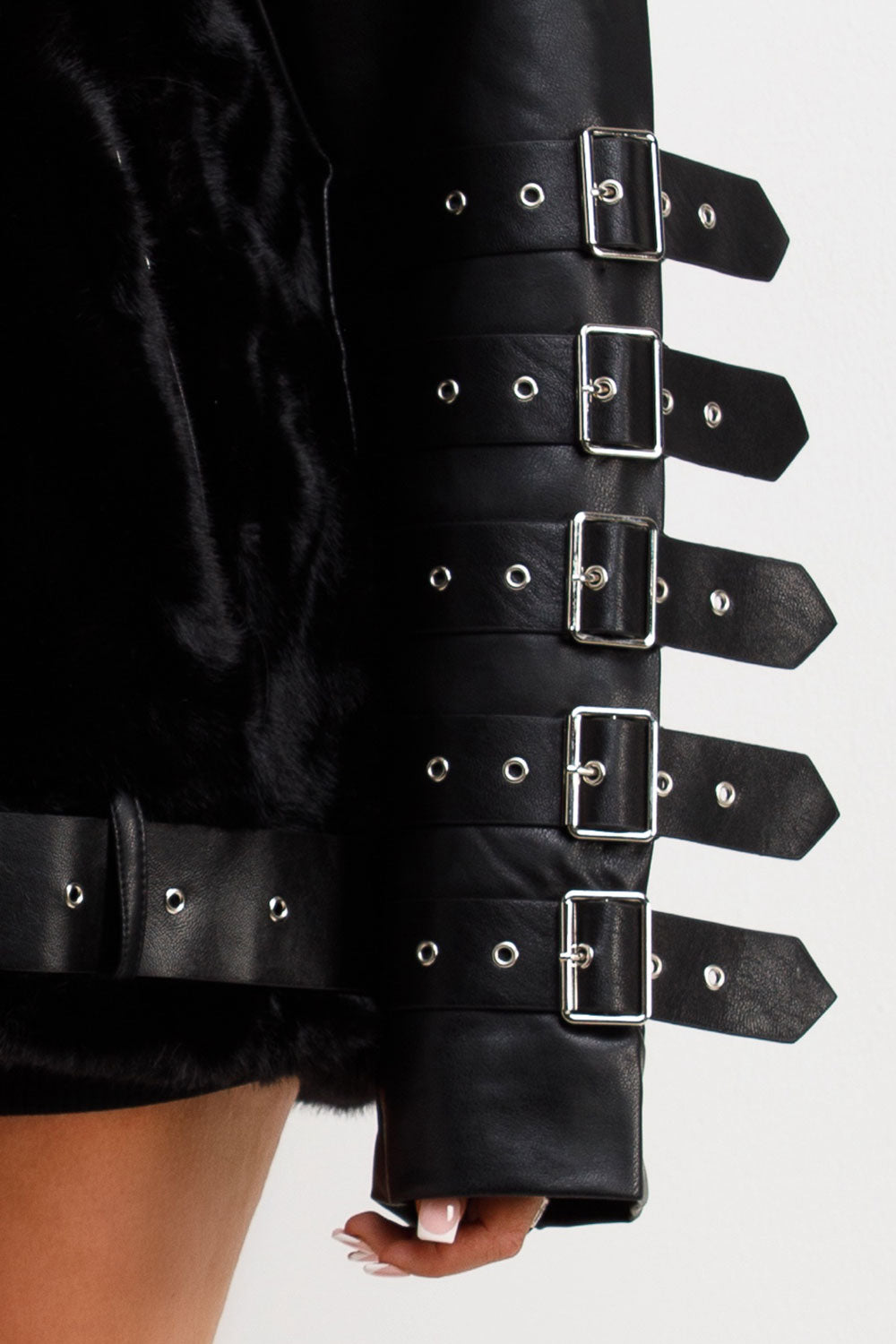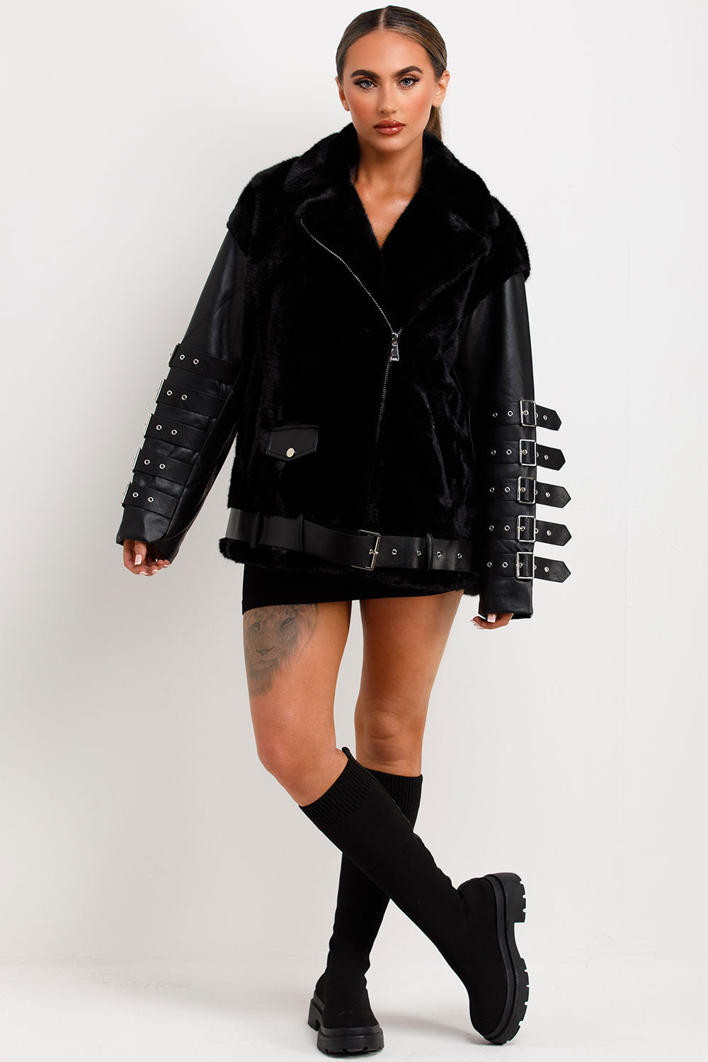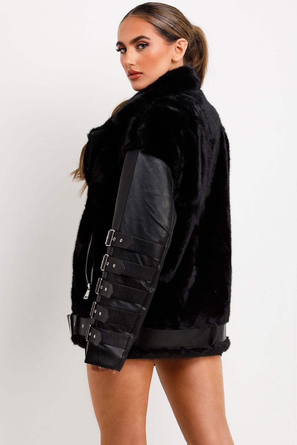 Faux fur faux leather aviator jacket with strap sleeve detail. This aviator jacket is going to give your outerwear look an edge. Featuring faux fur faux leather aviator jacket with zip fastening buckle detail on sleeves lapel collar pockets and belted hem, premium quality. Style this faux leather faux fur aviator jacket with matching accessories to complete the look we are loving. This faux fur faux leather aviator jacket is also available in other colours.