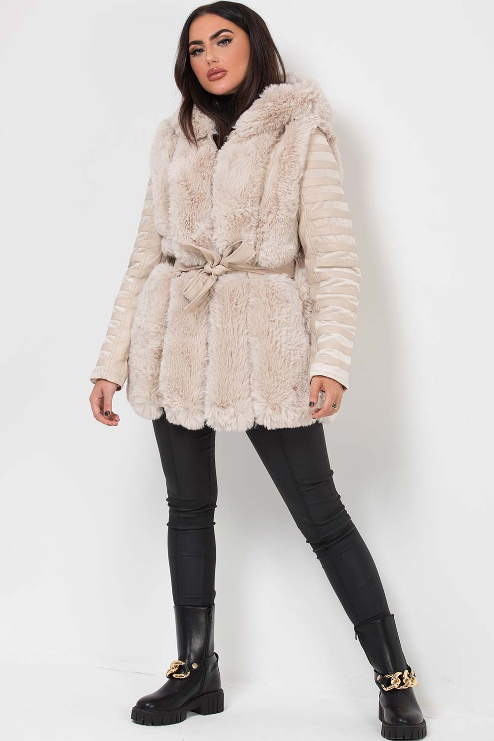 Faux leather faux fur jacket with panelled sleeve detail. This faux fur faux leather hooded jacket is a NEED for this new season. Featuring extremely warm luxury faux fur panel, faux leather material, zip fastening, waist belt and hooded with side pockets. Wear it with our high waisted leather look leggings to complete the look we are loving. Also available in Black.