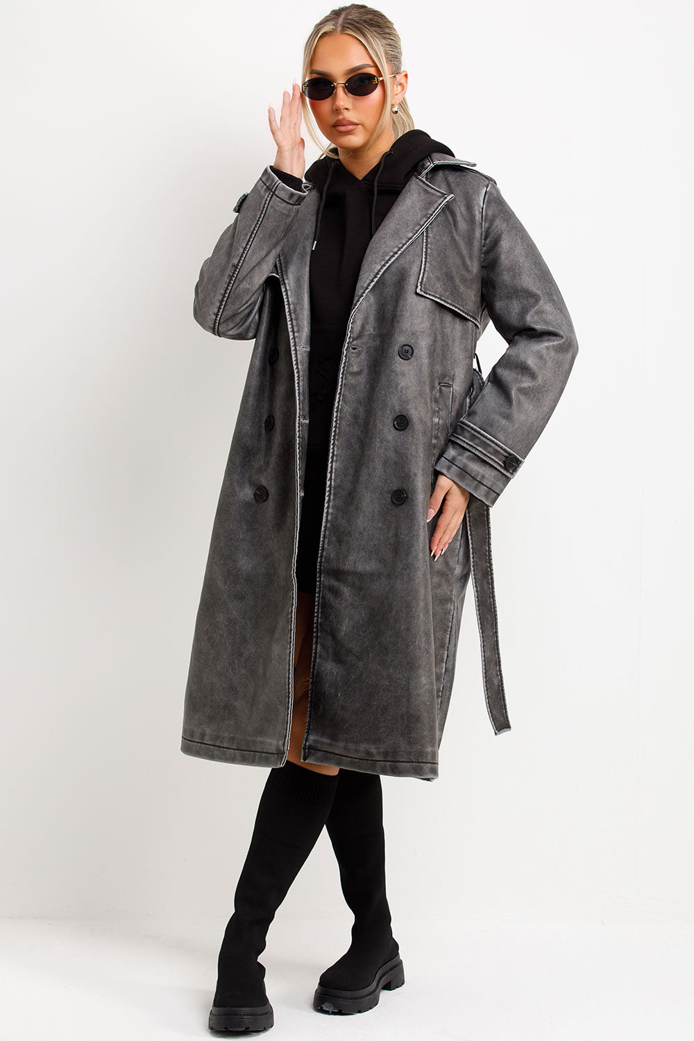 Faux leather trench coat. This trench coat is going to keep you on trend while keeping you cosy. Featuring faux leather longline trench coat with lapel collar button fastening adjustable waist belt and oversized fit. Style this long faux leather trench coat with any outfit to complete the look we are loving. This faux leather trench coat is weather resistant and perfect for this new season.