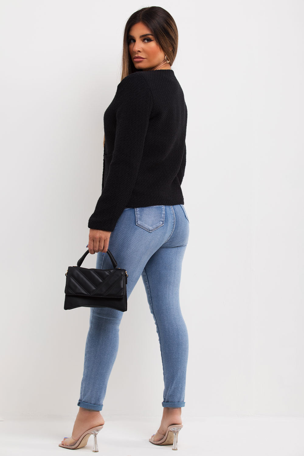 Tweed blazer jacket with gold buttons. Get ready for any occasion with this mock tweed jacket. Featuring mock tweed blazer jacket with gold button fastening. Style it with our nice nice jeans a top to complete the look we are loving. Also available in other colors.