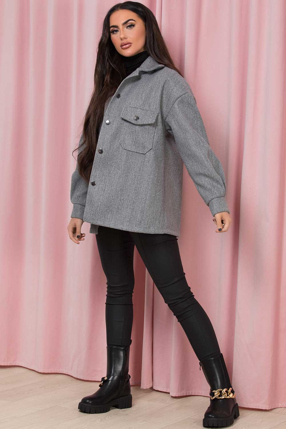 Grey shacket with double pockets. This oversized shacket is a must have for your new season collection babe. Featuring thick brushed fabric, button fastening, long sleeves and pocket front. Wear it with our high waisted leather look leggings to complete the cool casual look. Also available in other colours.