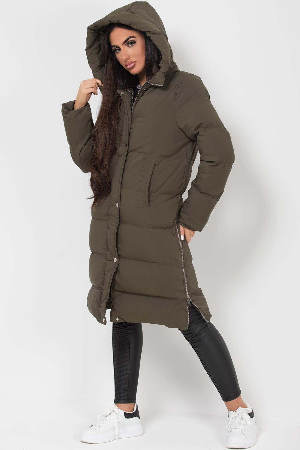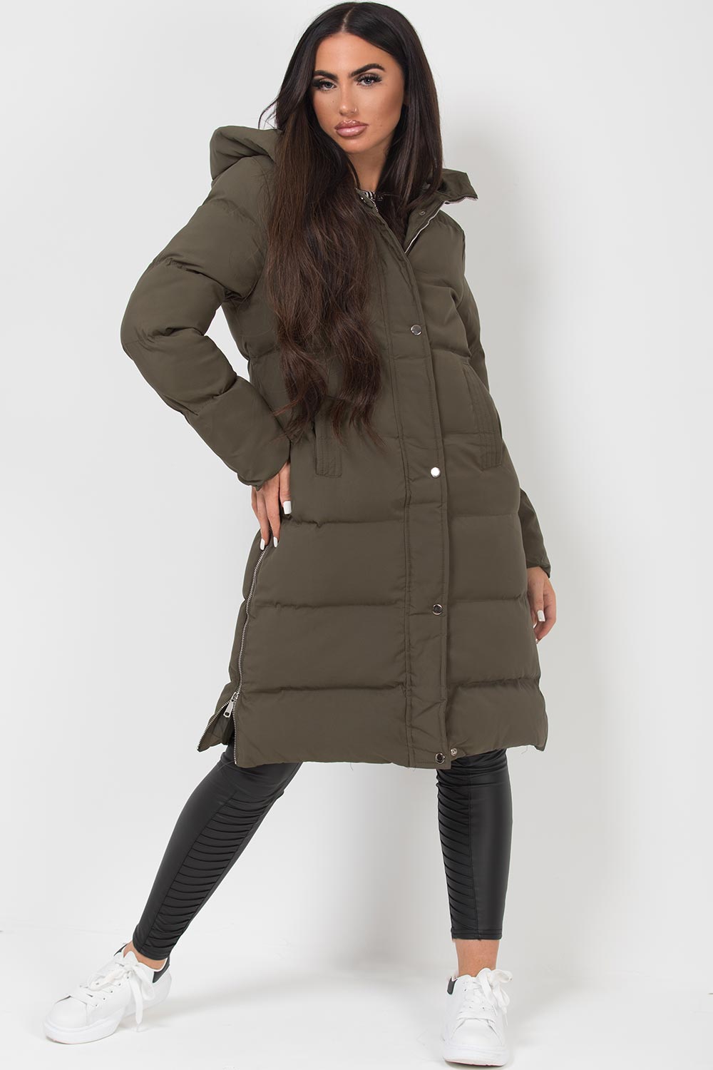 Long puffer coat with side zip. This padded puffer coat is a must have for this new season. This long padded coat features padded puffer style, zip and stud fastening, hooded and side zip detail, weather resistant. Perfect for everyday use. Also available in other colours.