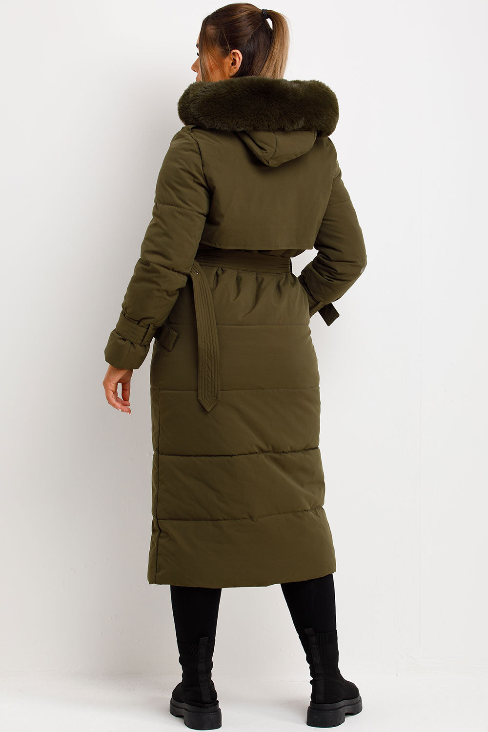 Long Puffer Trench Coat With Belt And Faux Fur Hood Khaki