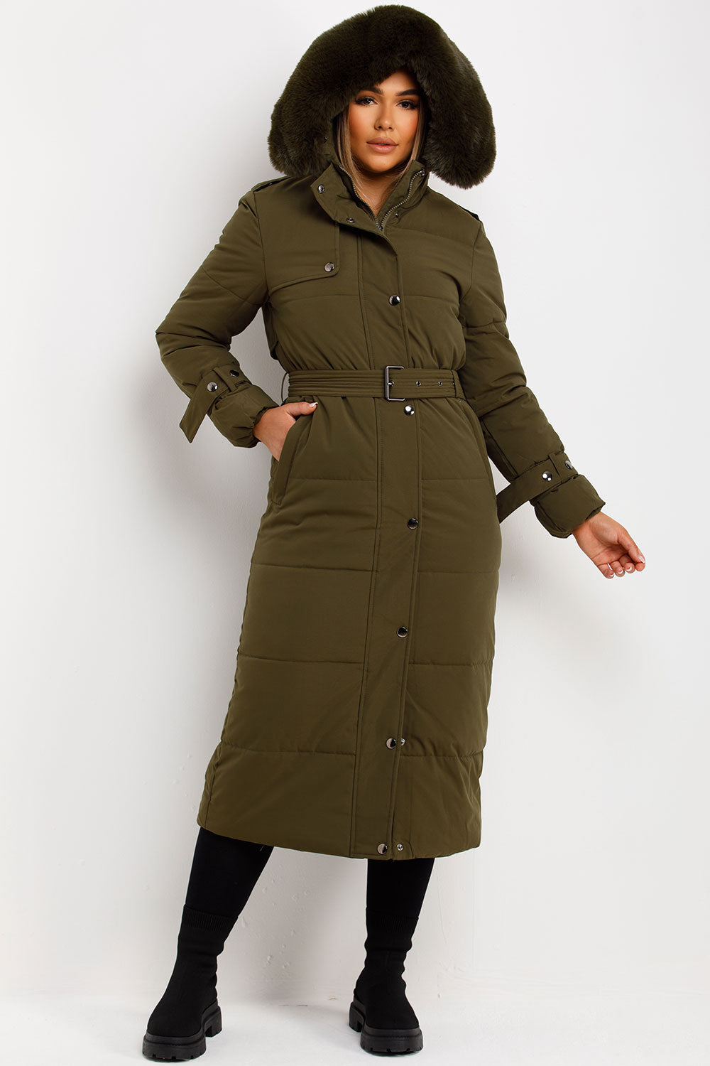 Long puffer trench coat with faux fur hood. This long puffer coat is a need not a want for this new season. Featuring thick warm puffer trench coat with zip and stud fastening adjustable belt and faux fur hood. Style this longline padded coat with with our unitards or knitwear to complete the look we are loving. This long coat is also available in other colours.