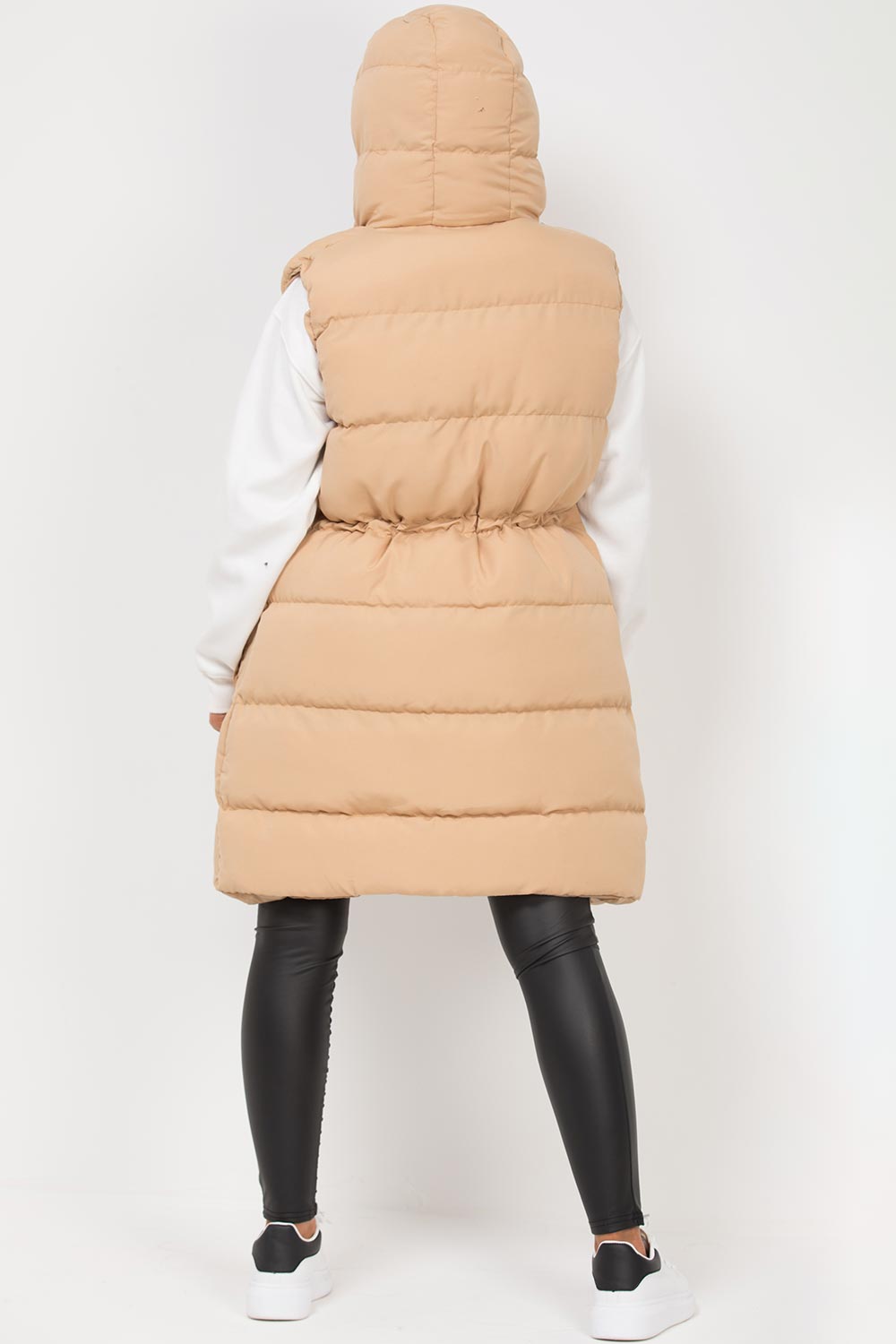Longline gilet puffer padded style with drawstring waist. Featuring padded puffer style longline gilet with drawstring waist, hooded, zip and stud fastening and pockets. Style it with our oversized hoodie and high waisted jeans to complete the perfect everyday look. Also available in Black, Grey, Khaki and Beige.