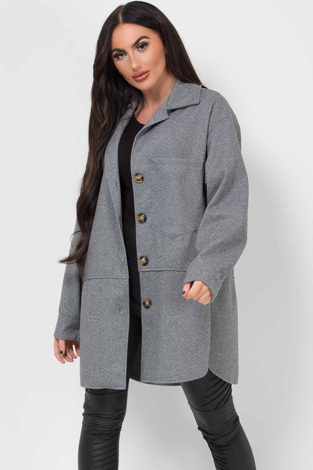 Oversized grey shacket jacket. This shacket will layer you up in style for this new season. Featuring warm comfortable fabric oversized fit button fastening and pockets. Style it with our leather look biker leggings or ripped jeans to complete the look we are loving. Also available in Beige.