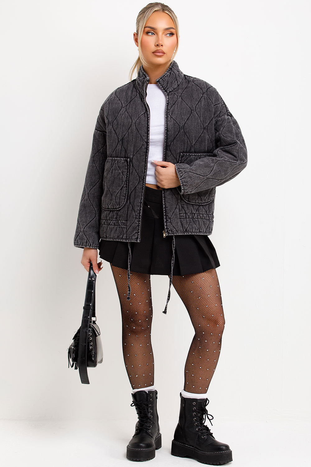 Quilted padded jacket. This padded jacket is trending right now and it is a must for your outerwear wardrobe. This cotton rich padded quilted puffer jacket features a funnel neck long sleeves zip fastening front patch pockets and adjustable drawstring hem. Style this quilted padded jacket with any outfit to complete the new season look.