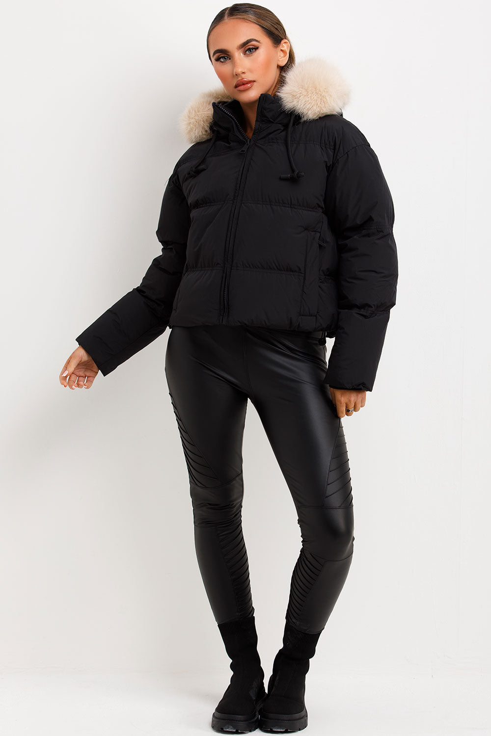 Puffer jacket with fur hood. This fur hood jacket is sure to be perfect addition for your outerwear wardrobe. Featuring faux fur hood puffer jacket with zip fastening pockets drawstring hem extremely warm wind proof padded weather resistant and premium quality. This fur hood puffer jacket is perfect to complete you new season look. This puffer jacket with faux fur hood is also available in other colours.