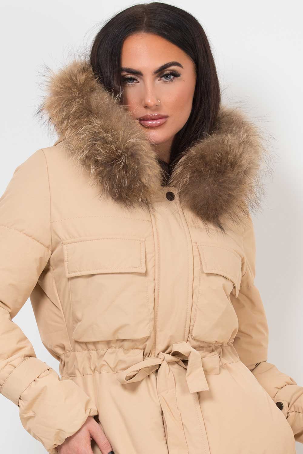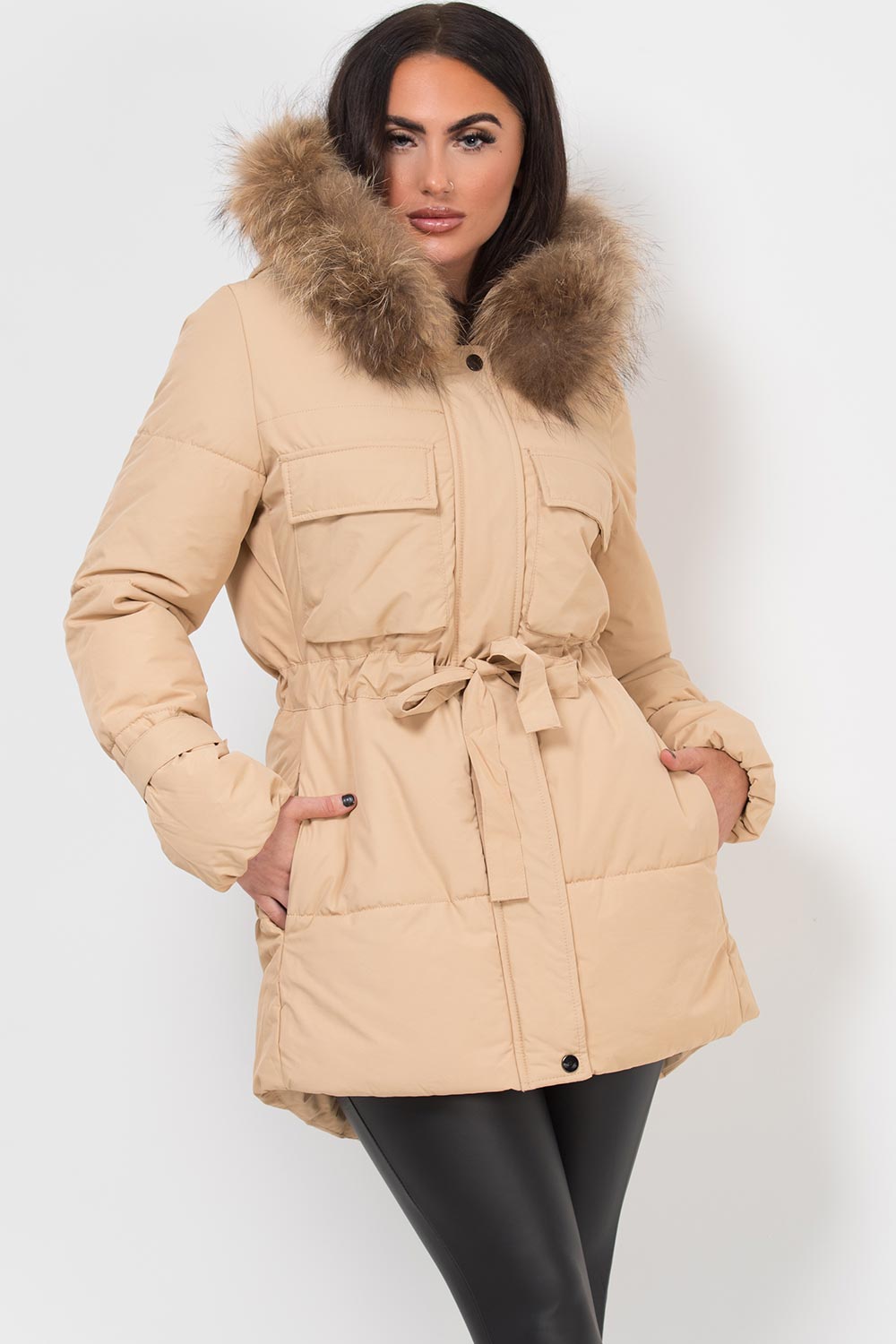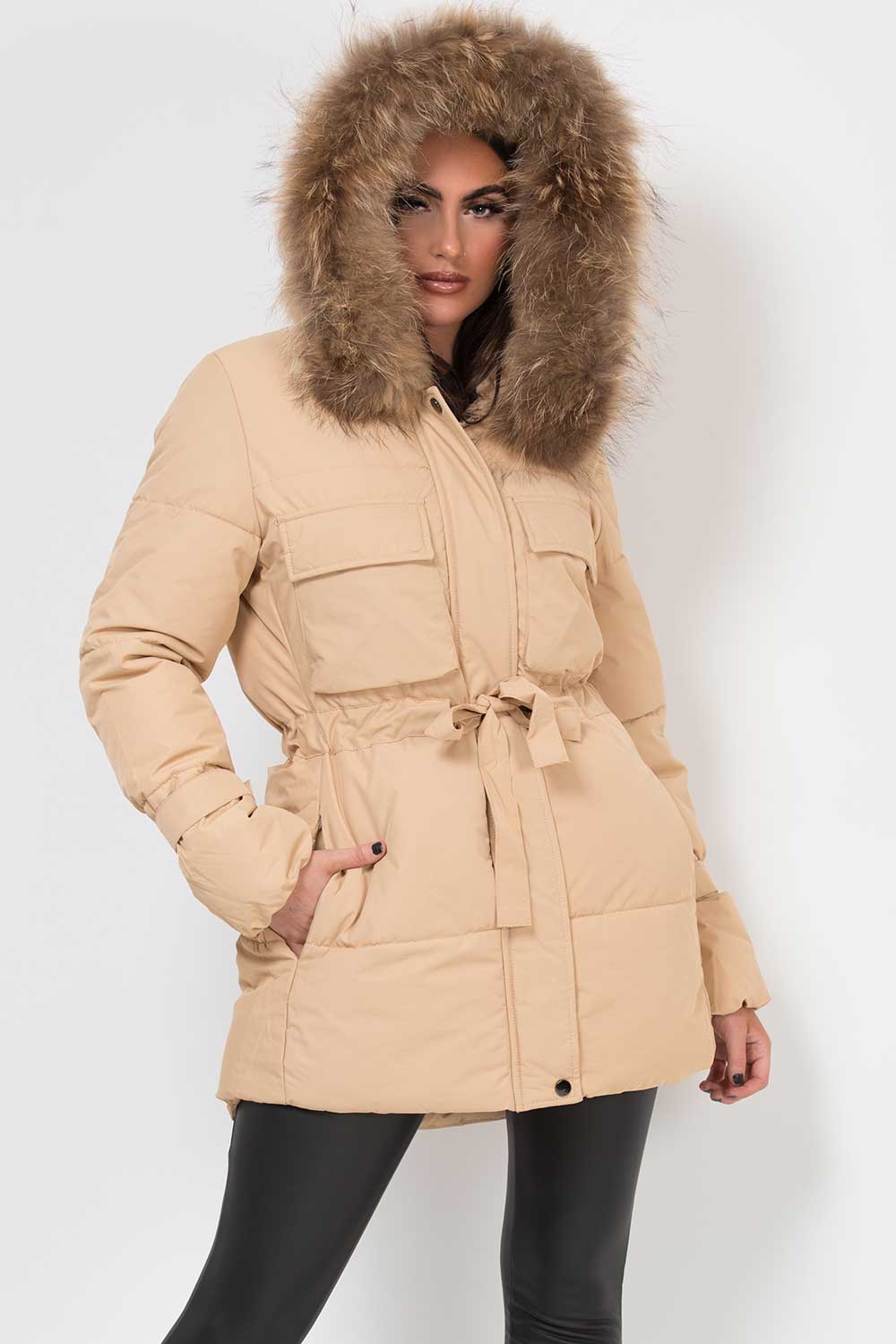 Real fur coat with drawstring. This puffer coat with real fur hood is a MUST HAVE for this new season. Featuring puffer coat with drawstring waist, extremely warm, weather resistant, pockets, adjustable drawstring waist and hood with ethically sourced detachable natural fur trim. Also available in Black.