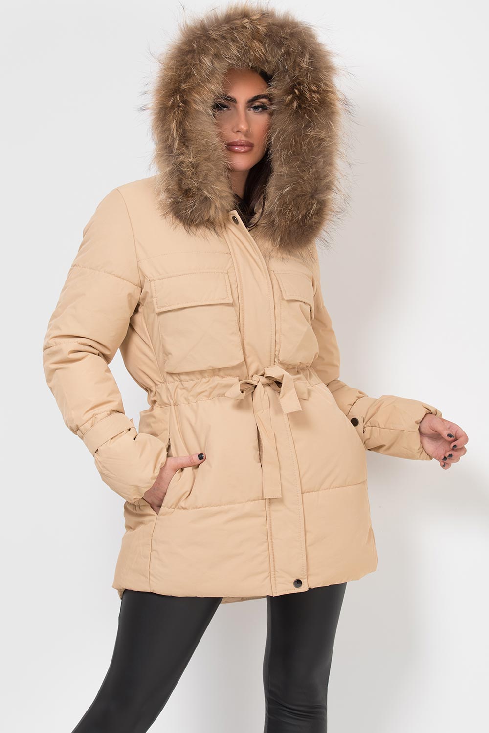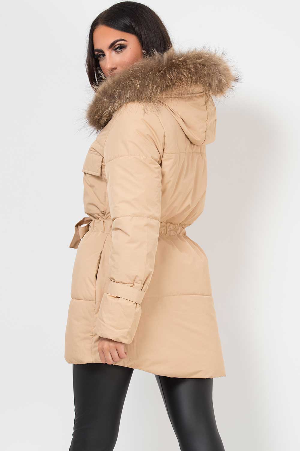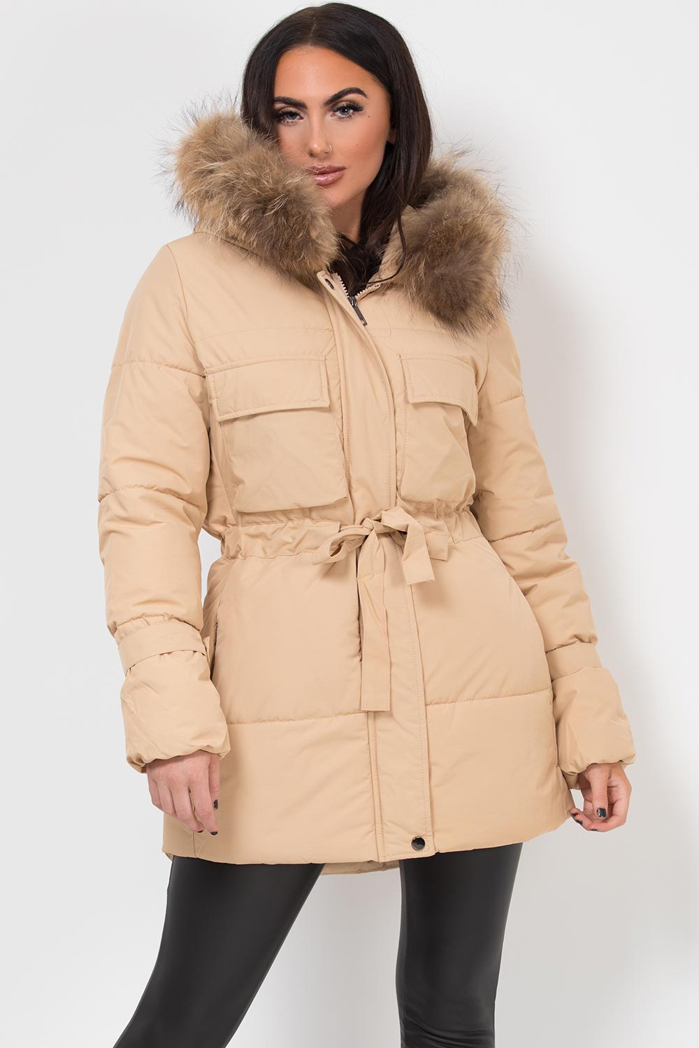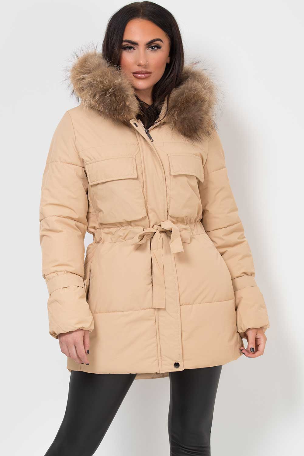 Real fur coat with drawstring. This puffer coat with real fur hood is a MUST HAVE for this new season. Featuring puffer coat with drawstring waist, extremely warm, weather resistant, pockets, adjustable drawstring waist and hood with ethically sourced detachable natural fur trim. Also available in Black.