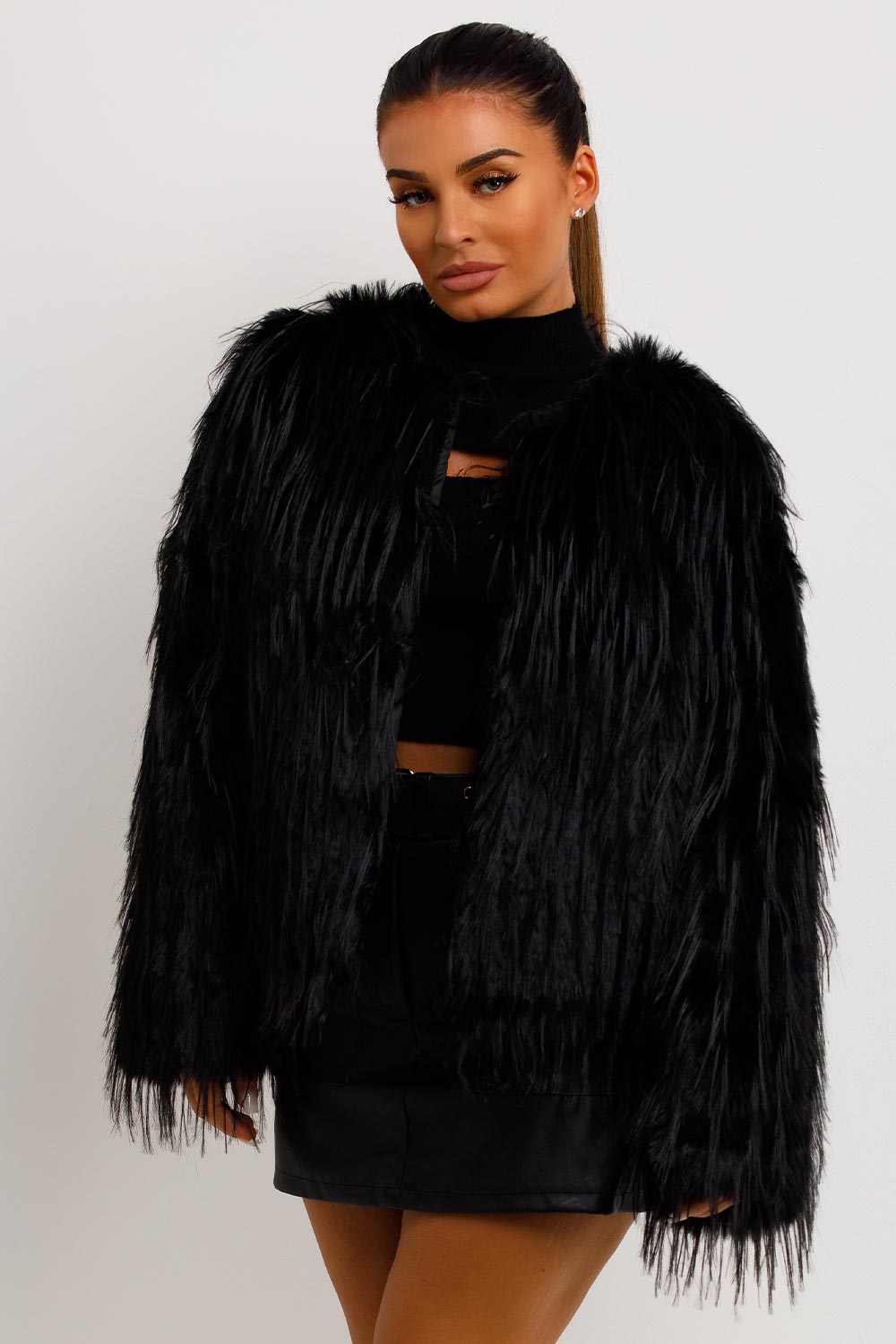 Shaggy faux fur jacket. This faux fur jacket is trending babe and you have to have this. Featuring shaggy faux fur jacket short length and long sleeves. Style this faux fur jacket with any outfit to complete the cute new season look. This fur jacket is also available in other colours.