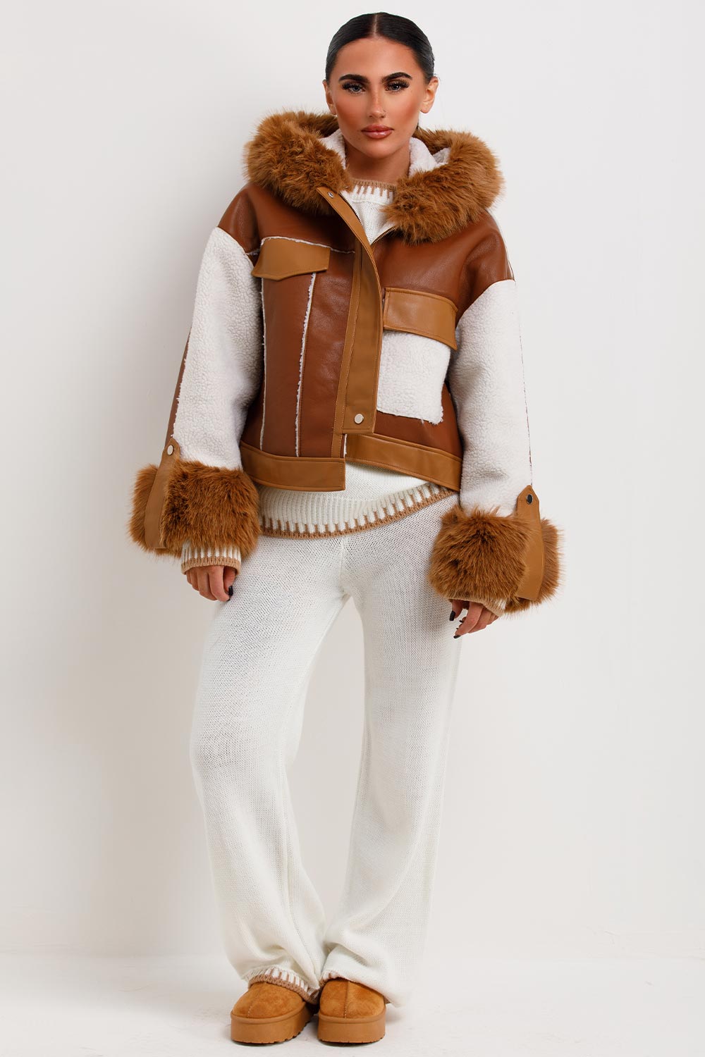 Shearling faux leather jacket with faux fur hood. This shearling jacket is going to be the most trendiest piece in your outerwear wardrobe. Featuring faux leather jacket with faux fur hood and shearling detailing, extremely warm and cosy, contrast colours. Style this fur hood jacket with our knitted loungewear and platform slippers to complete the look we are loving. This shearling jacket is also available in other colours.