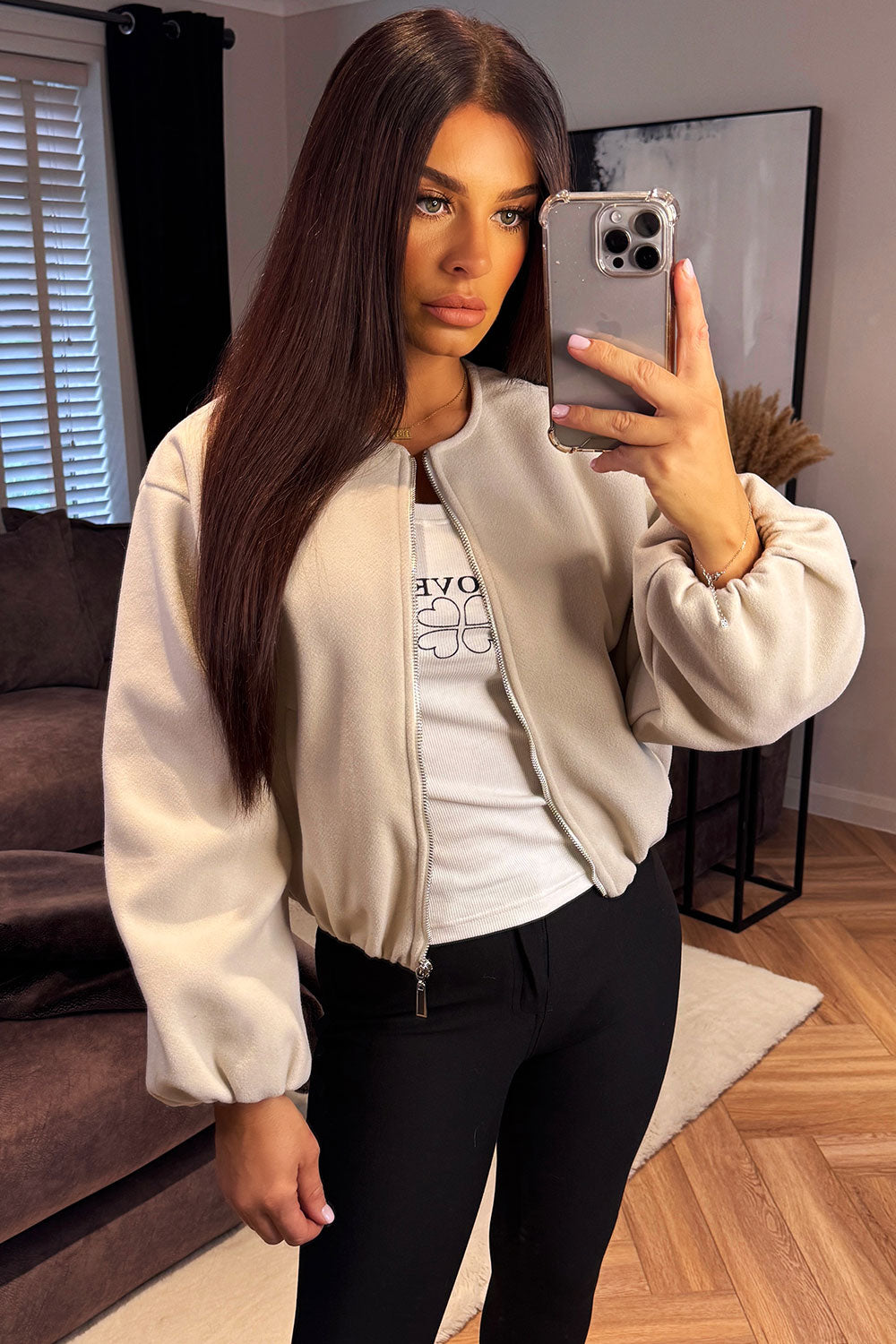 Soft bomber jacket. This bomber jacket is a must have for your new season outerwear wardrobe. Featuring soft bomber jacket with round neck elastic cuffs long sleeves pockets on front elasticated hem and zip up front. Style this bomber jacket with any outfit to complete the look we are loving. This soft bomber jacket is also available in other colours.