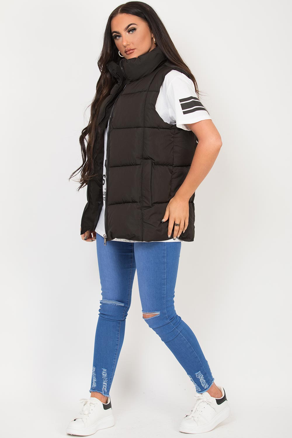 Black Long Puffer Gilet With Lapel Collar & Belt