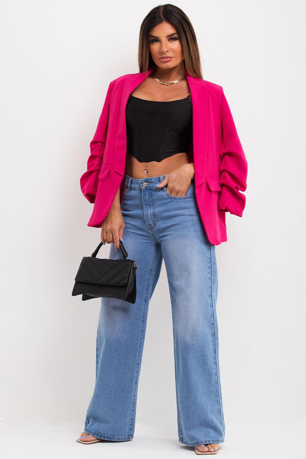 Blazer Jacket With Ruched Sleeves Pink Leopard Print