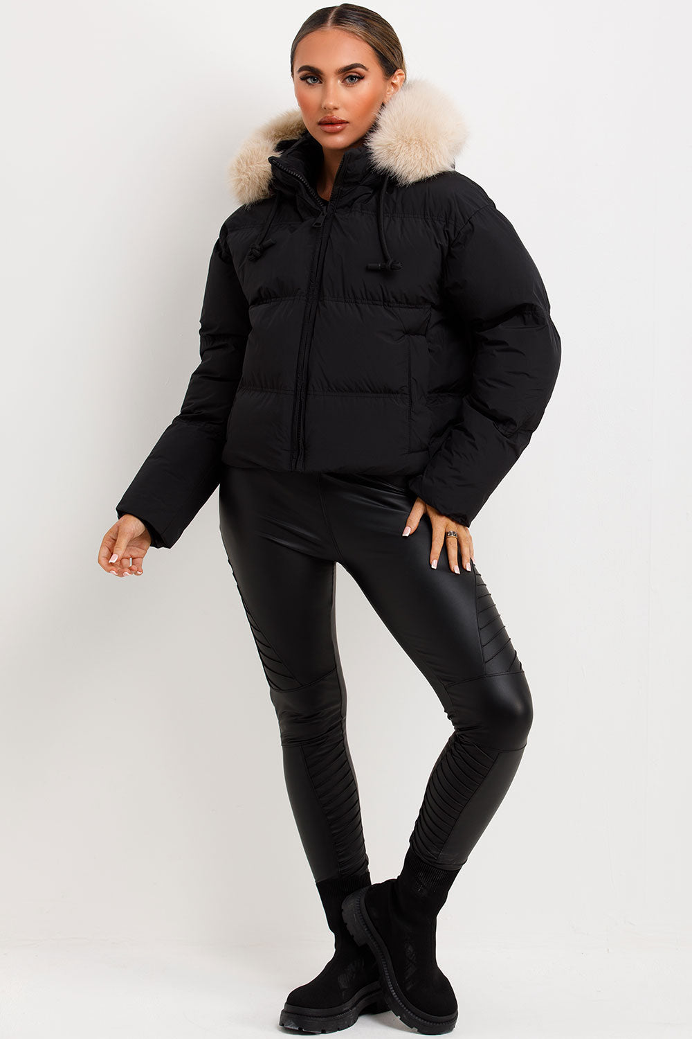 Wet Look Puffer Coat With Faux Fur Hood