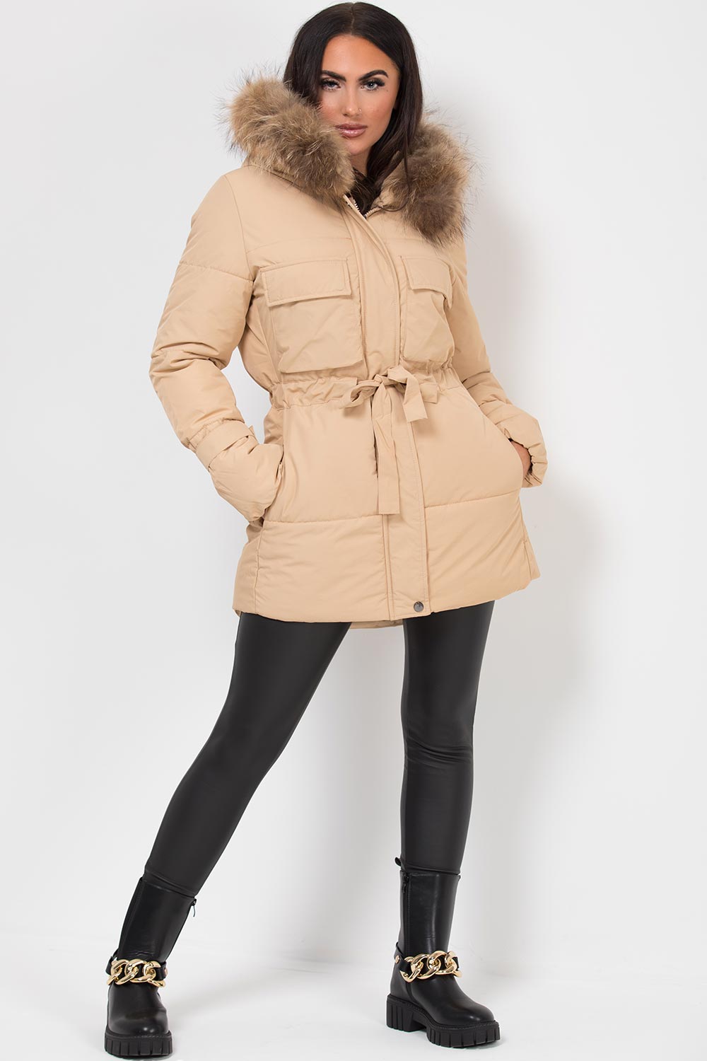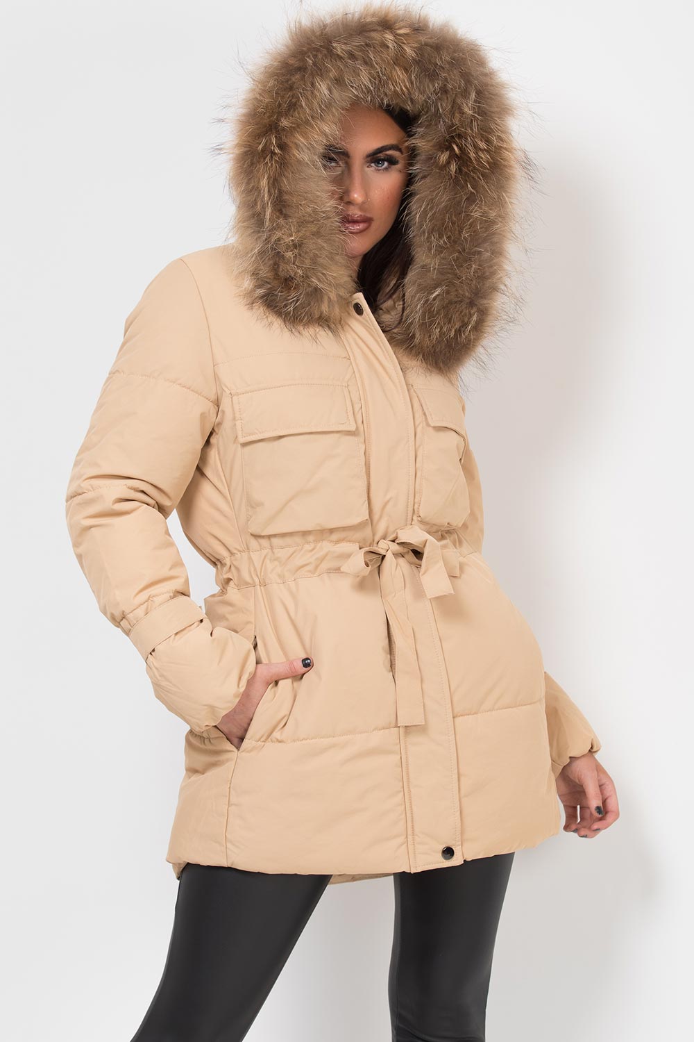 Faux Fur Trim Puffer Hooded Down Jacket With Belt Beige
