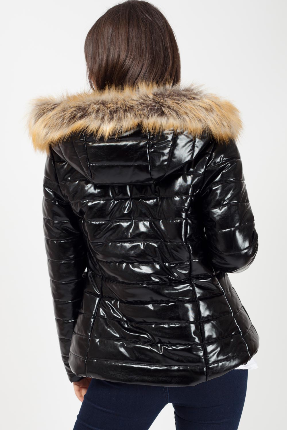 Shiny Puffer Belted Jacket With Faux Fur Hood