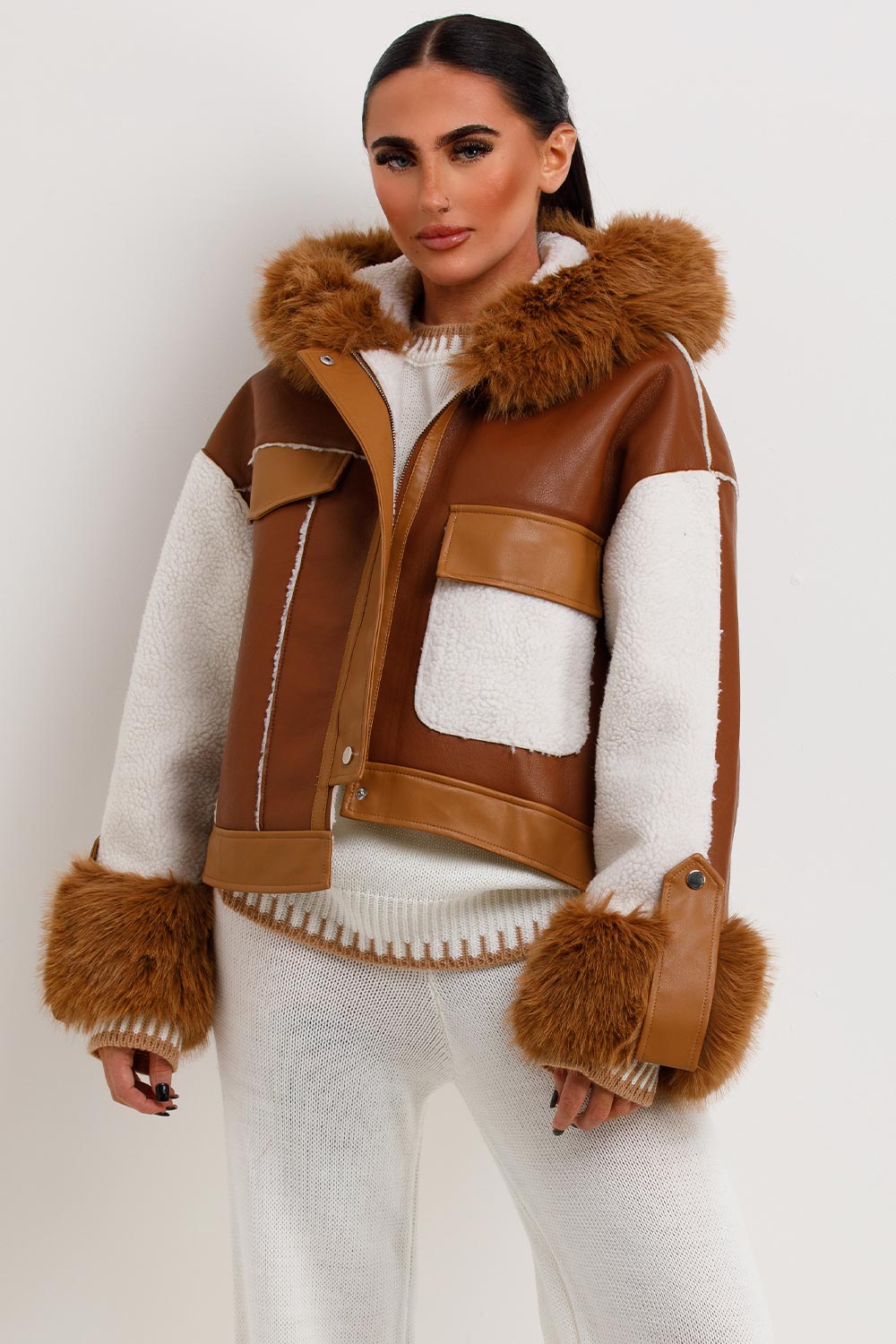 Shearling Faux Leather Jacket With Faux Fur Hood Brown