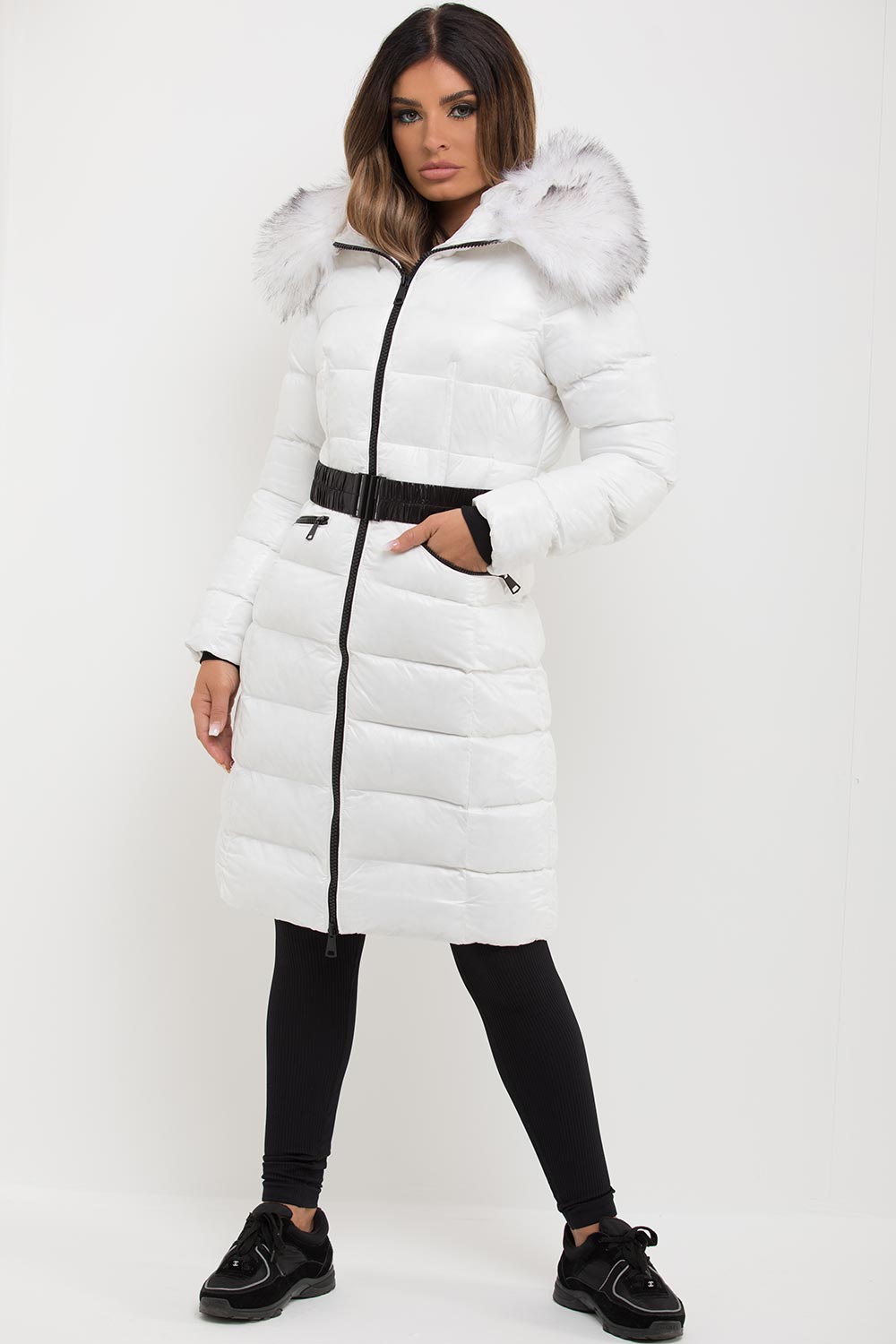 White Long Puffer Padded Jacket With Faux Fur Hood & Belt