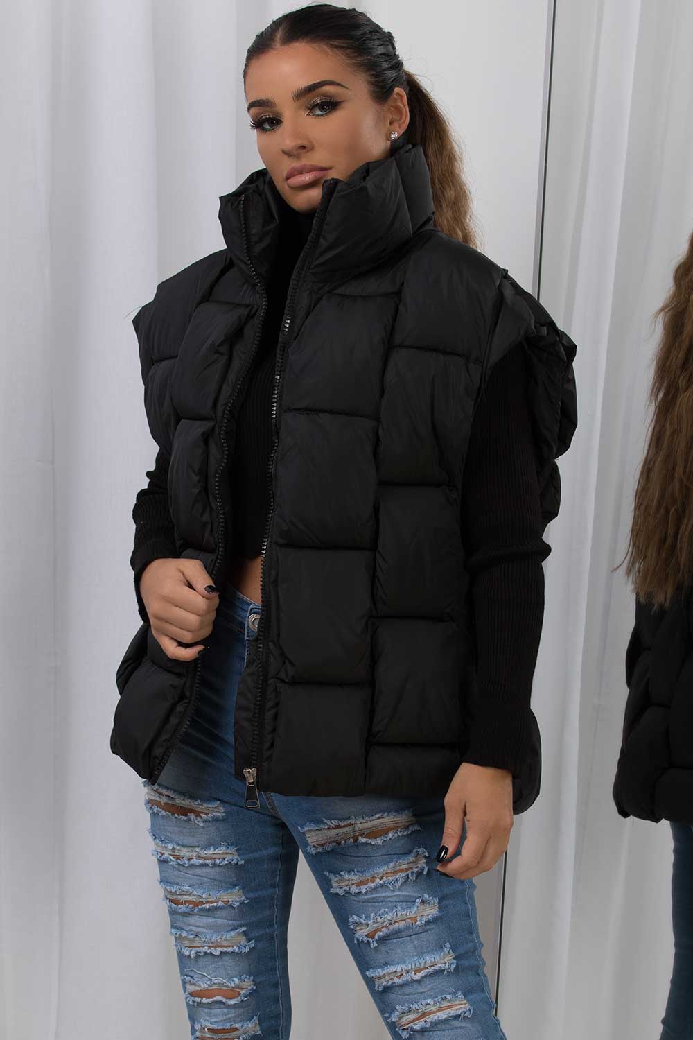 Black Puffer Quilted Jacket With Faux Fur Hood And Belt
