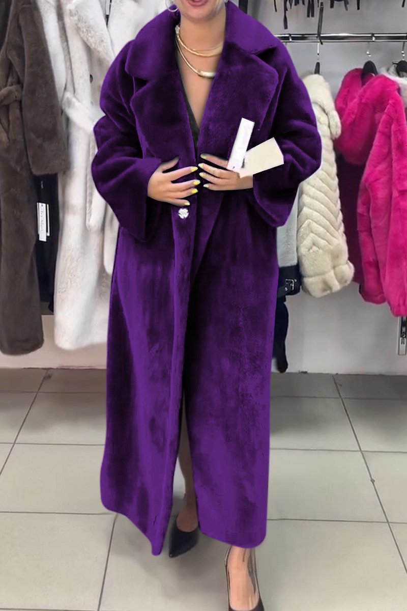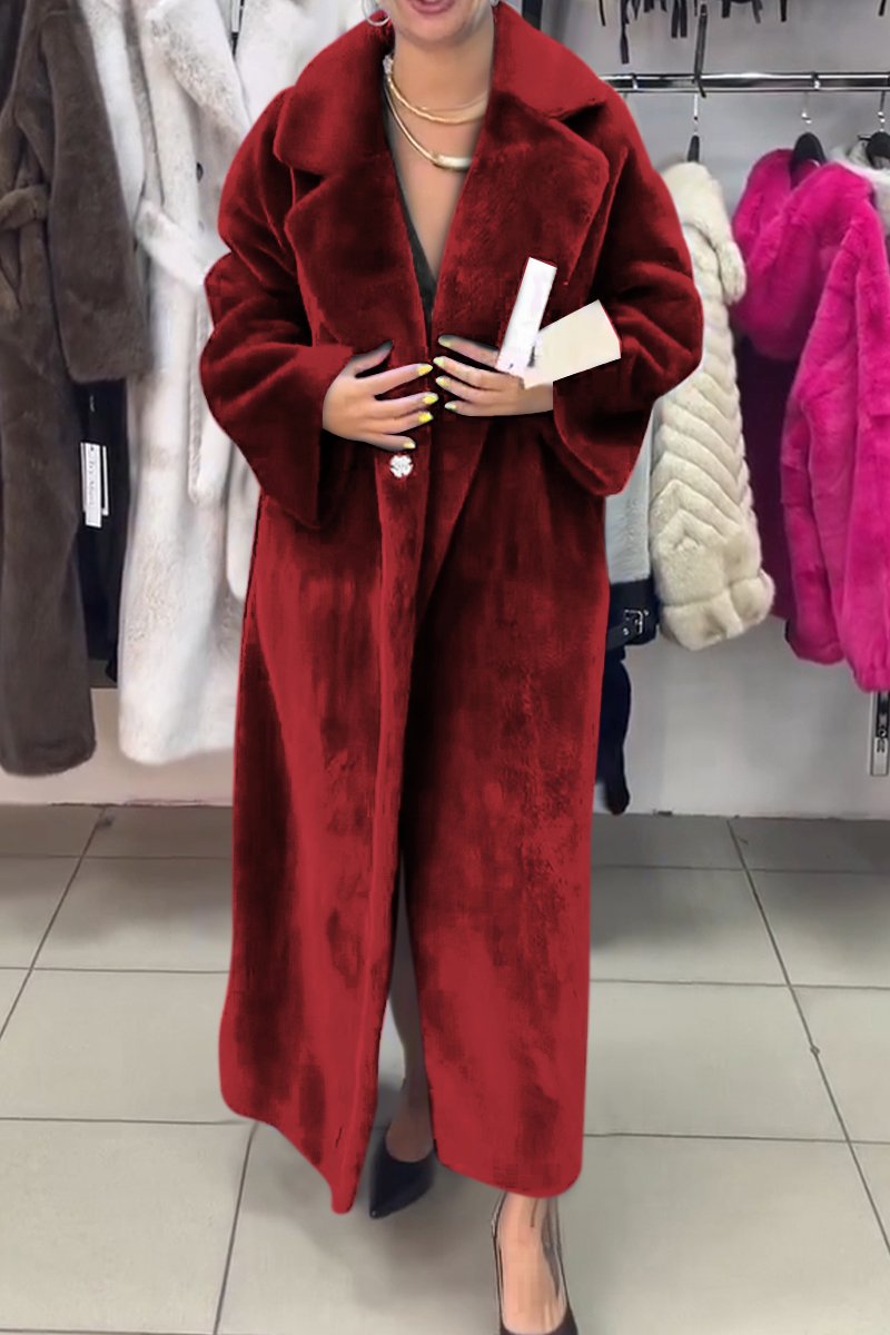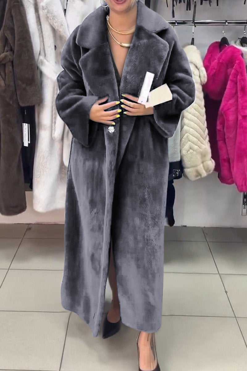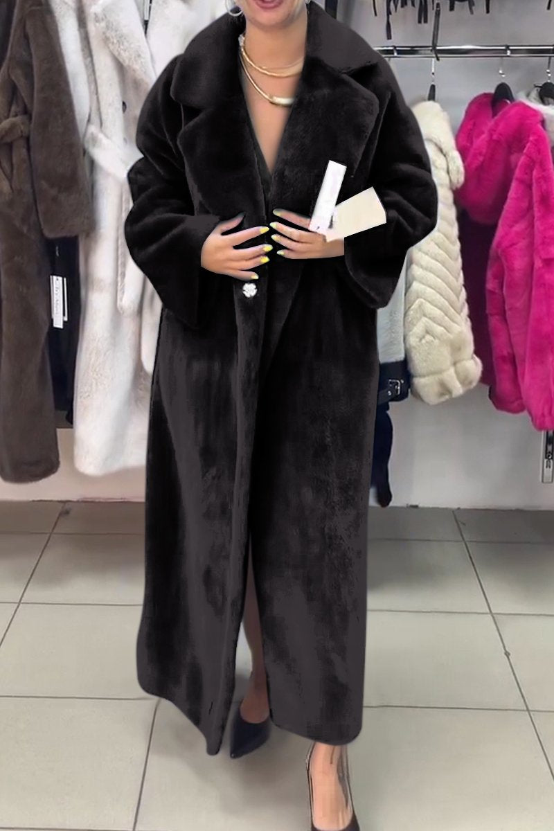 Ladies Lapel Solid Color Faux Fur Warm Long Coat