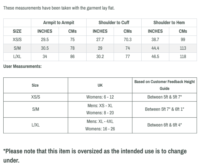 - Size Guide: XS/S (5ft - 5ft 7), S/M (5ft 7 - 6ft 1), L/XL (6ft - 6ft 4). For more detailed sizing information please see the Size Guide which is above the Size options.