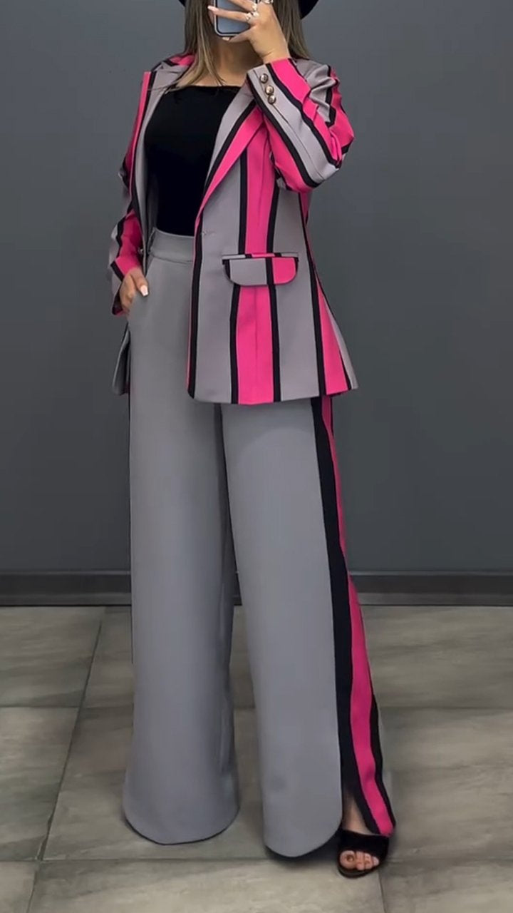 Women's Lapel Long Sleeve Contrast Striped Casual Suit