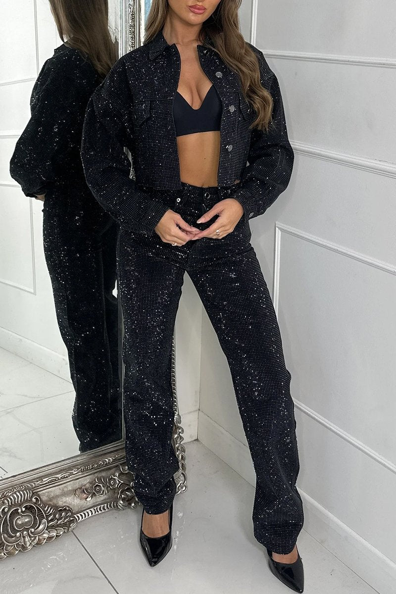 Women's Lapel Rhinestone Shiny Casual Denim Suit