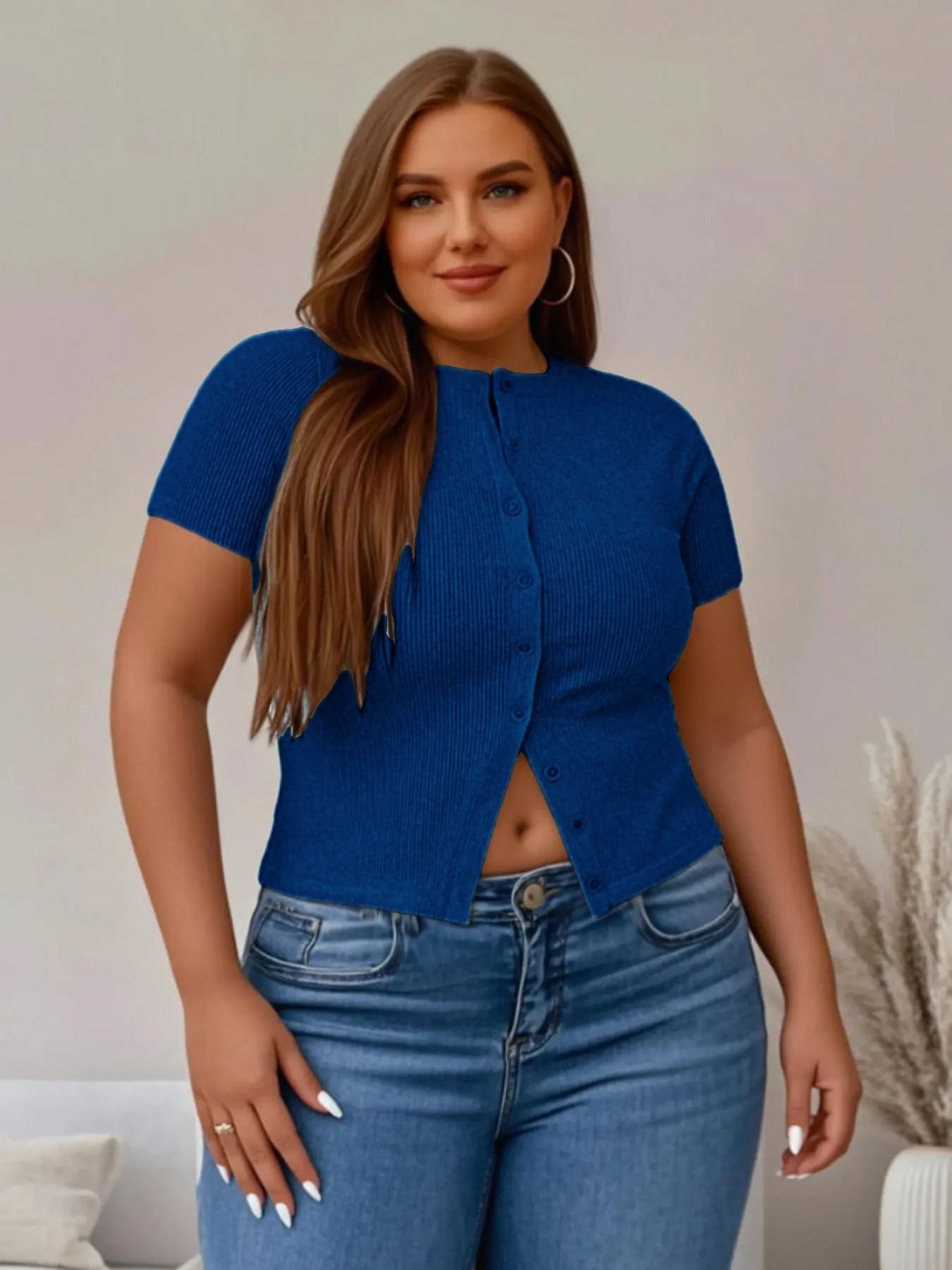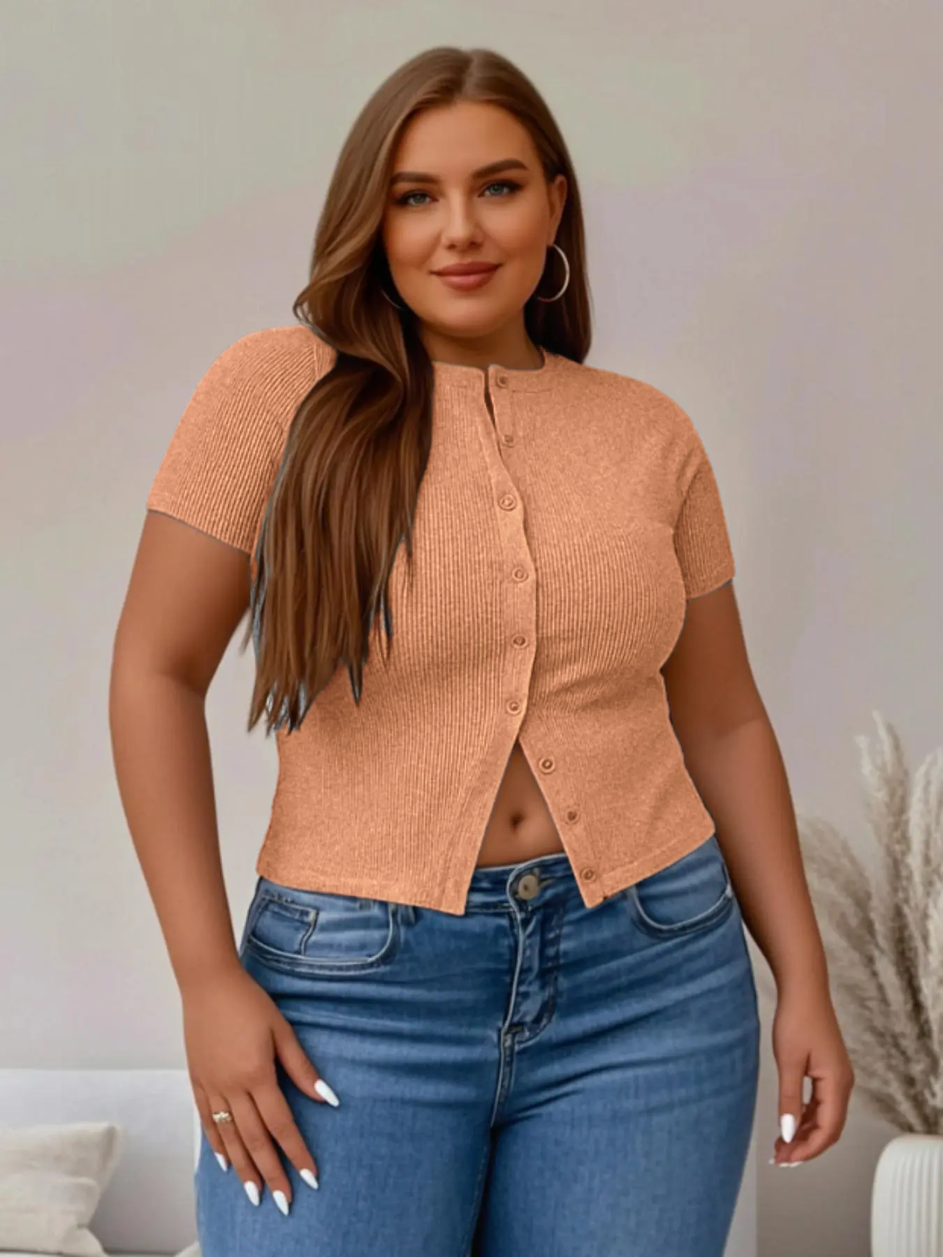 • [Plus Size] Solid Ribbed Short Sleeve Top, Casual Button Front Top for Summer, Summer Tops, Women's Plus Clothing for Daily Wear, Womenswear