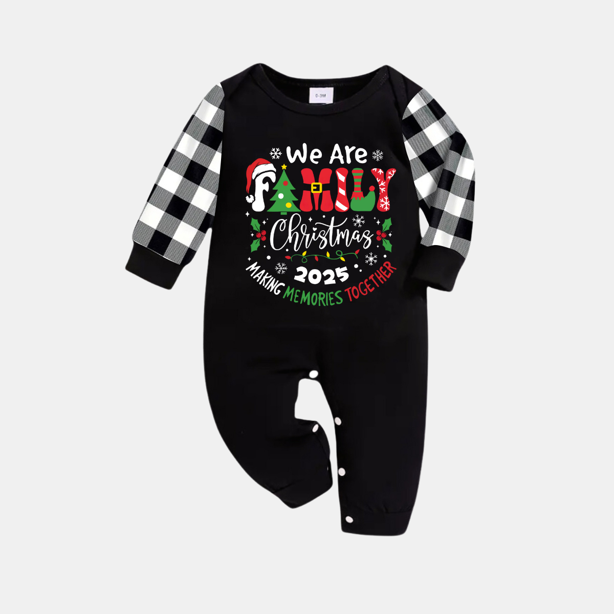"We are Family 2025 Christmas Make Memories Together" Slogan Print Black Long Sleeve Top with Black And White Plaid Pants Family Matching Pajamas