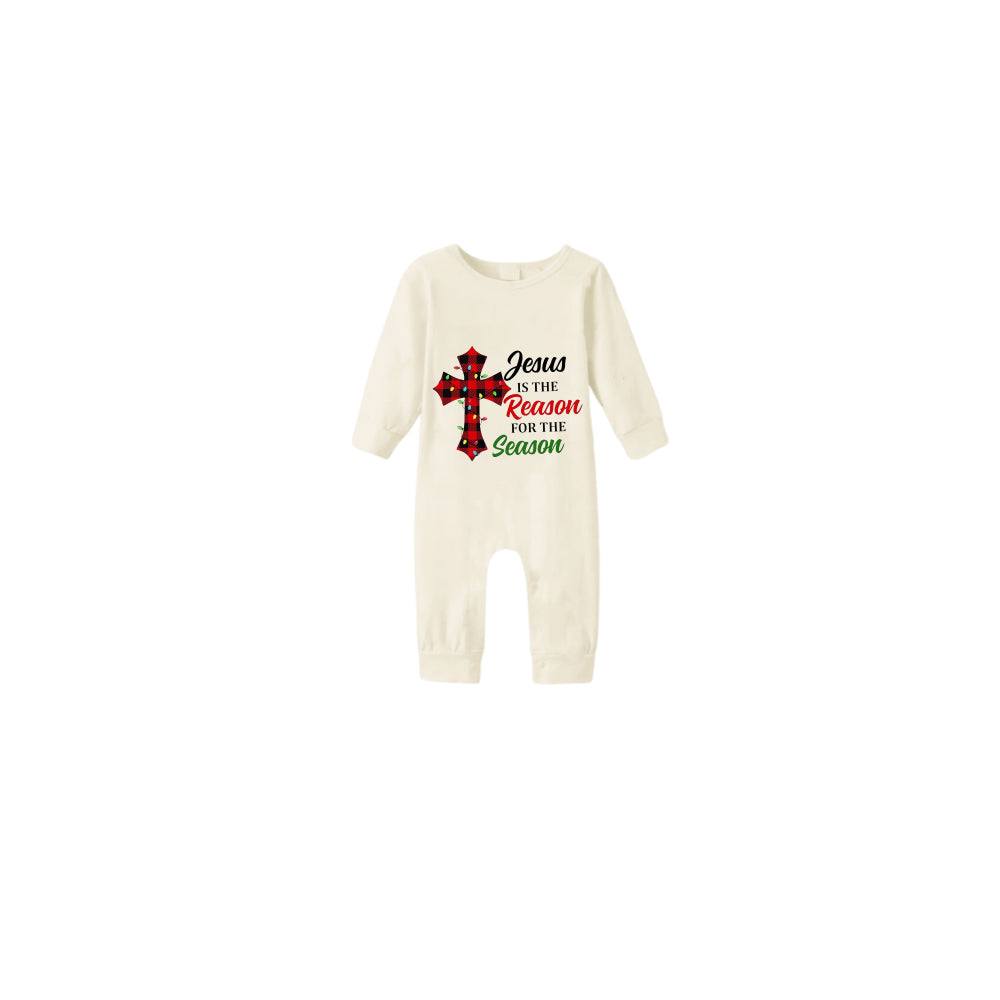 Beige Christmas Pattern Print Christmas Pajamas Set With "Jesus Is The Reason For The Season" Slogan Print