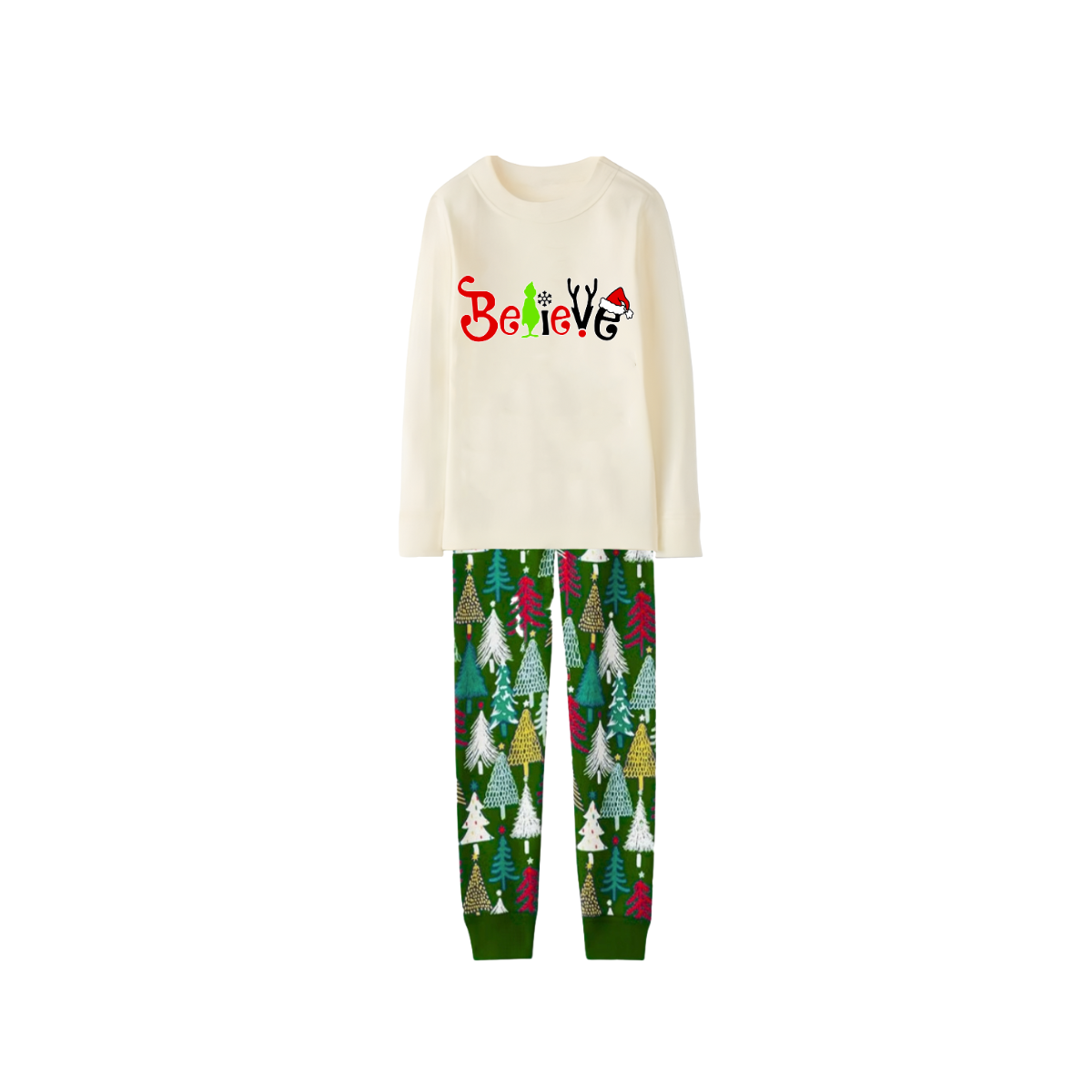 Believe Letter Print Family Pajamas Set - Cream Top, Green Pants, Christmas Tree Pattern