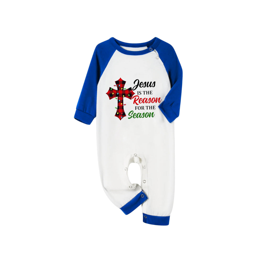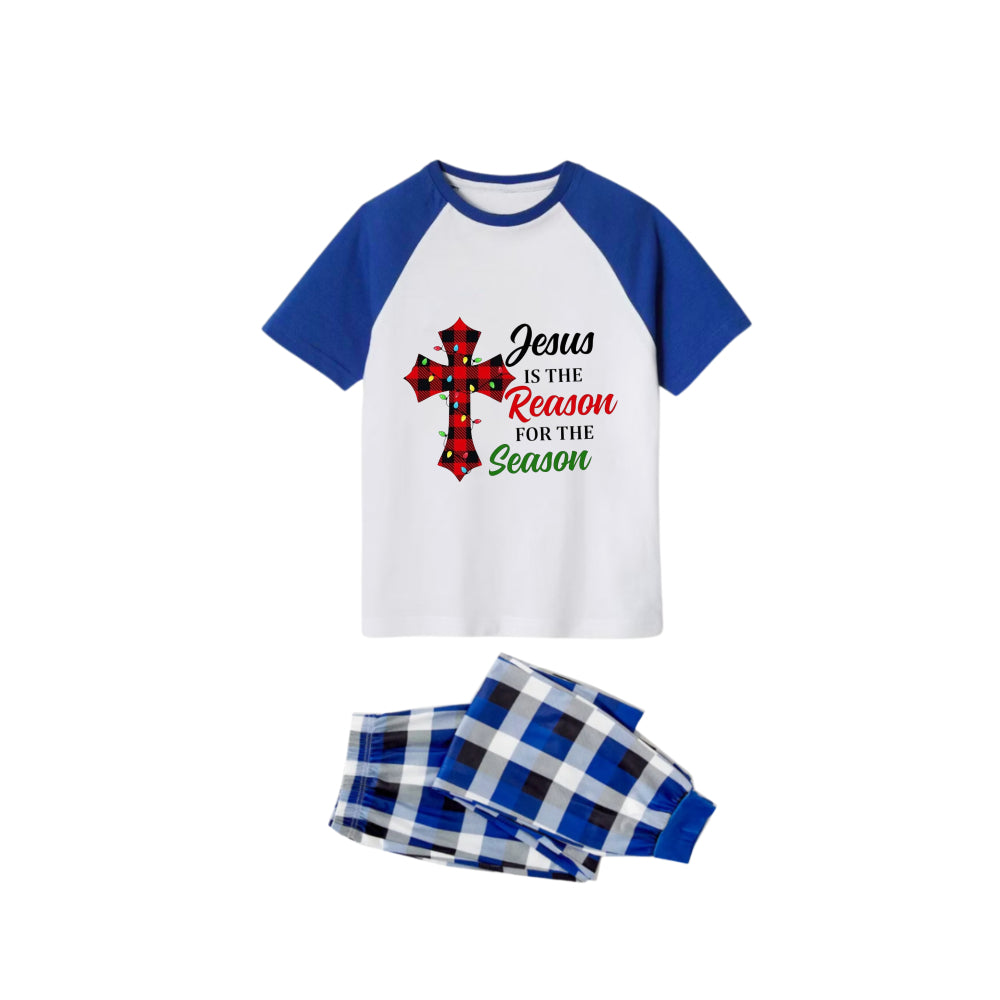 Blue Plaid Short Sleeve Christmas Pajamas Set With "Jesus Is The Reason For The Season" Slogan Print