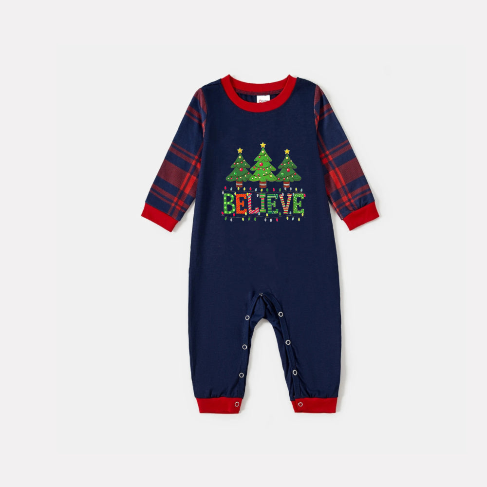 Christmas Family Matching Pajamas-Navy & Red Plaid Pjs Set with Christmas Tree and "Believe" Text Print