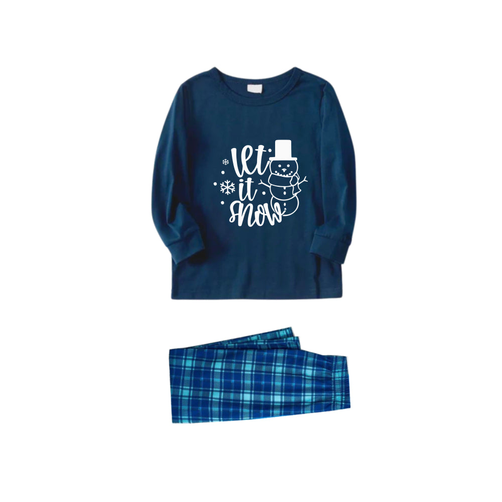 Christmas Family Matching Pajamas-Navy & Sky Blue Plaid Pjs Set with "Let It Snow" and Snowman Cartoon Print