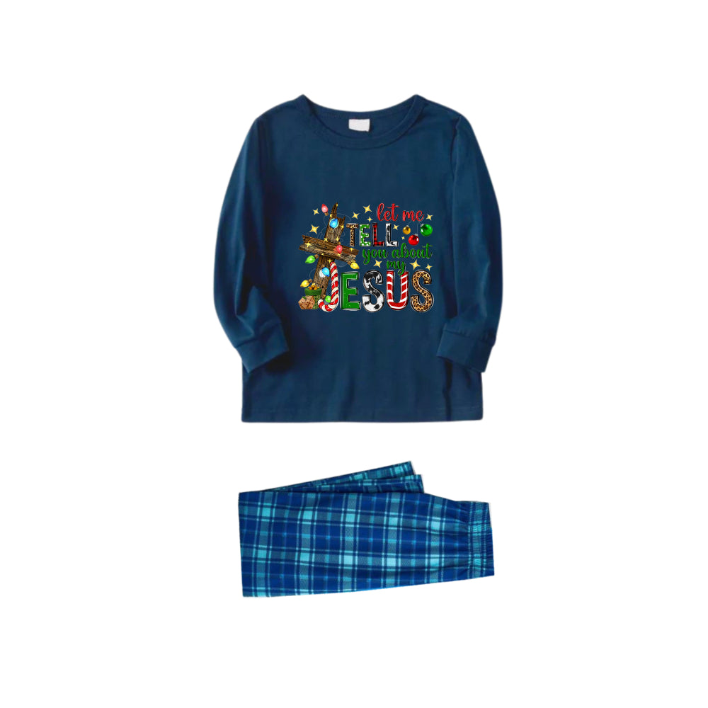 Christmas Family Matching Pajamas-Navy & Sky Blue Plaid Pjs Set with "Let Me Tell You About My Jesus" Print