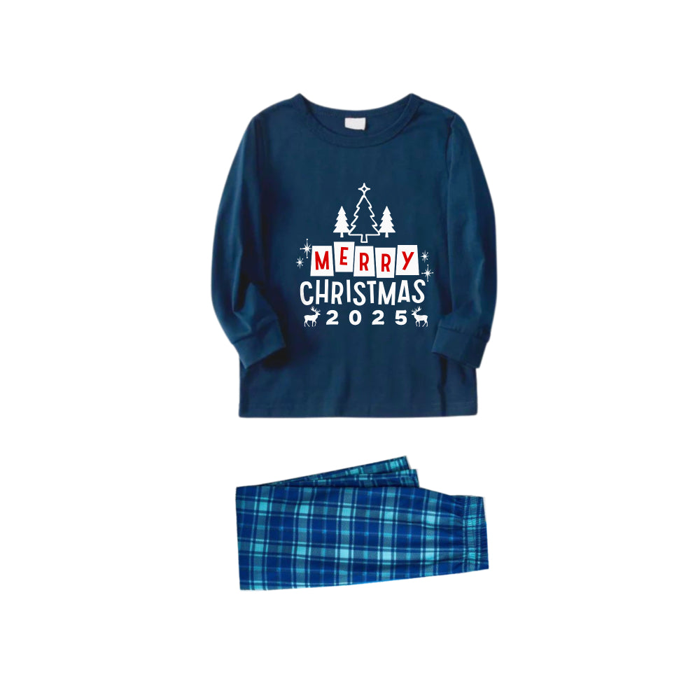 Christmas Family Matching Pajamas-Navy & Sky Blue Plaid Pjs Set with "Merry Christmas 2025" Print