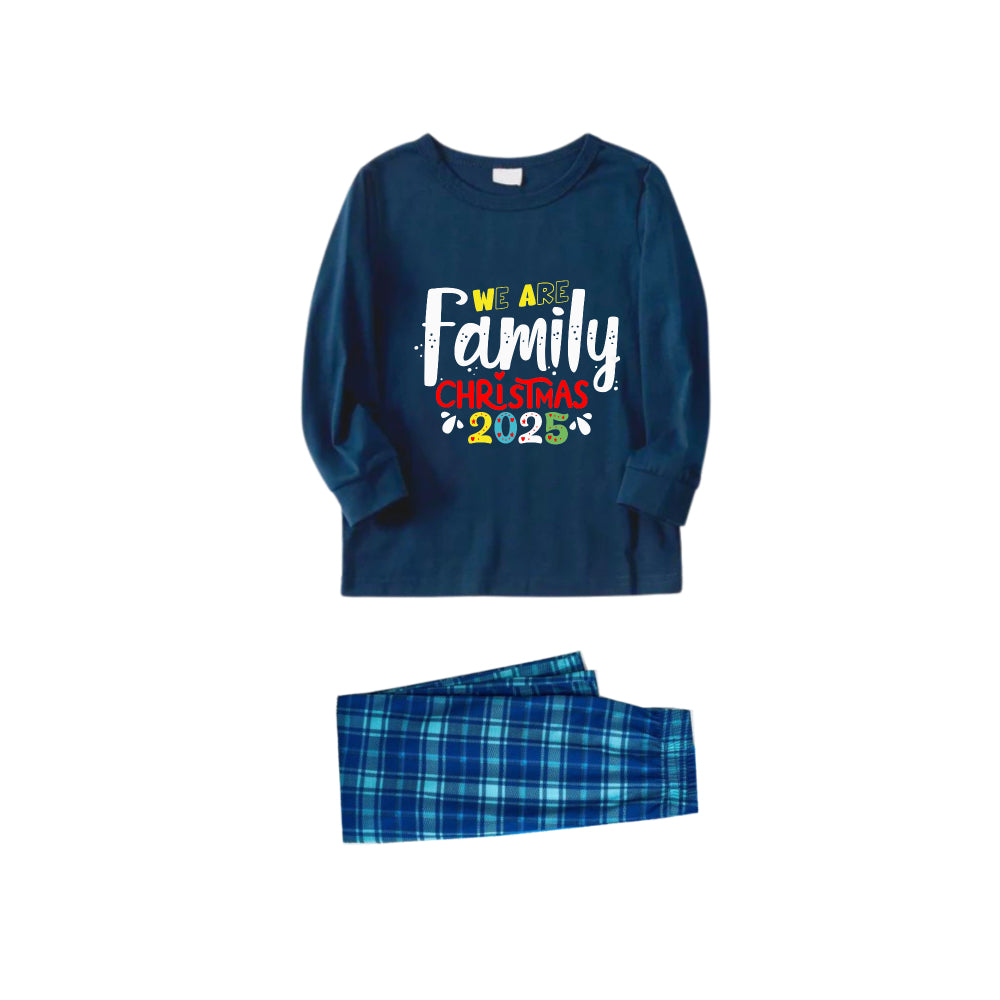 Christmas Family Matching Pajamas-Navy & Sky Blue Plaid Pjs Set with "We Are Family Christmas 2025" Artistic Font Print