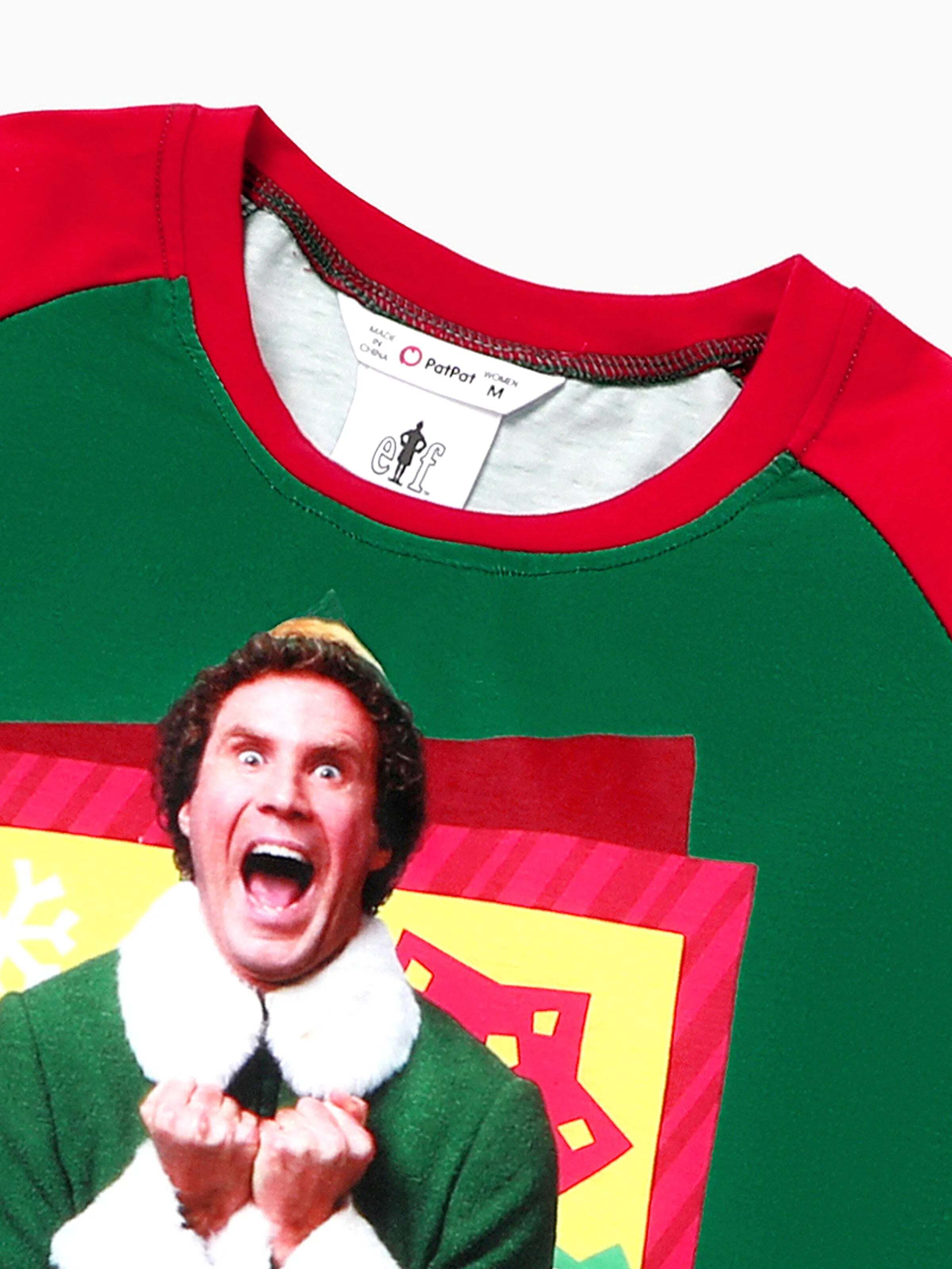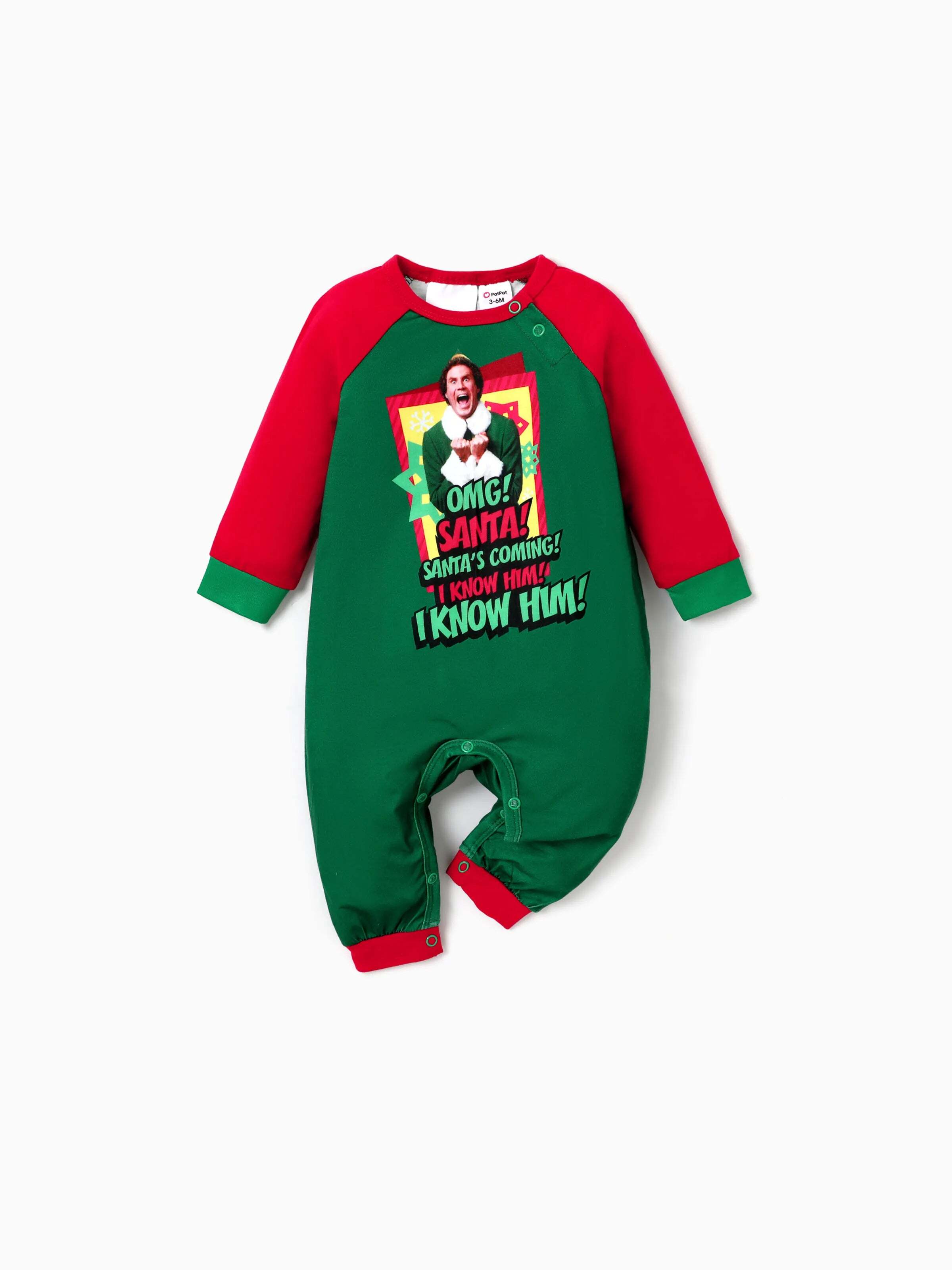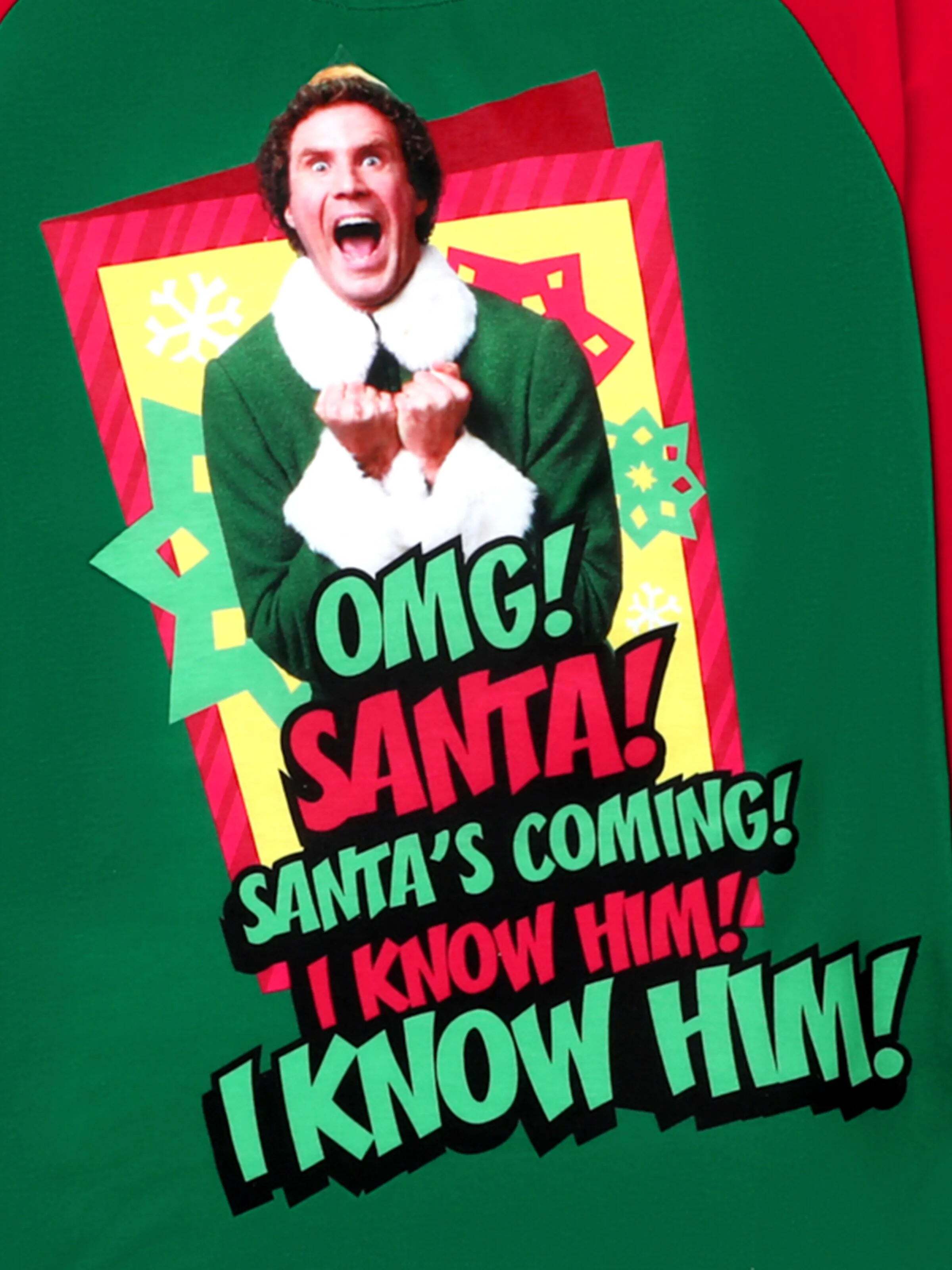 This Elf™ Christmas pajama set features a fun "OMG! Santa's coming!" graphic with Buddy the Elf. The red and green color-block design, paired with holiday-themed pants, is perfect for family photos and cozy celebrations. Available for adults, kids, and babies.