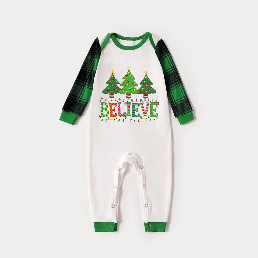 Green Raglan Top Green Plaid Christmas Pajamas Set With "BELIEVE" and Christmas Tree Print
