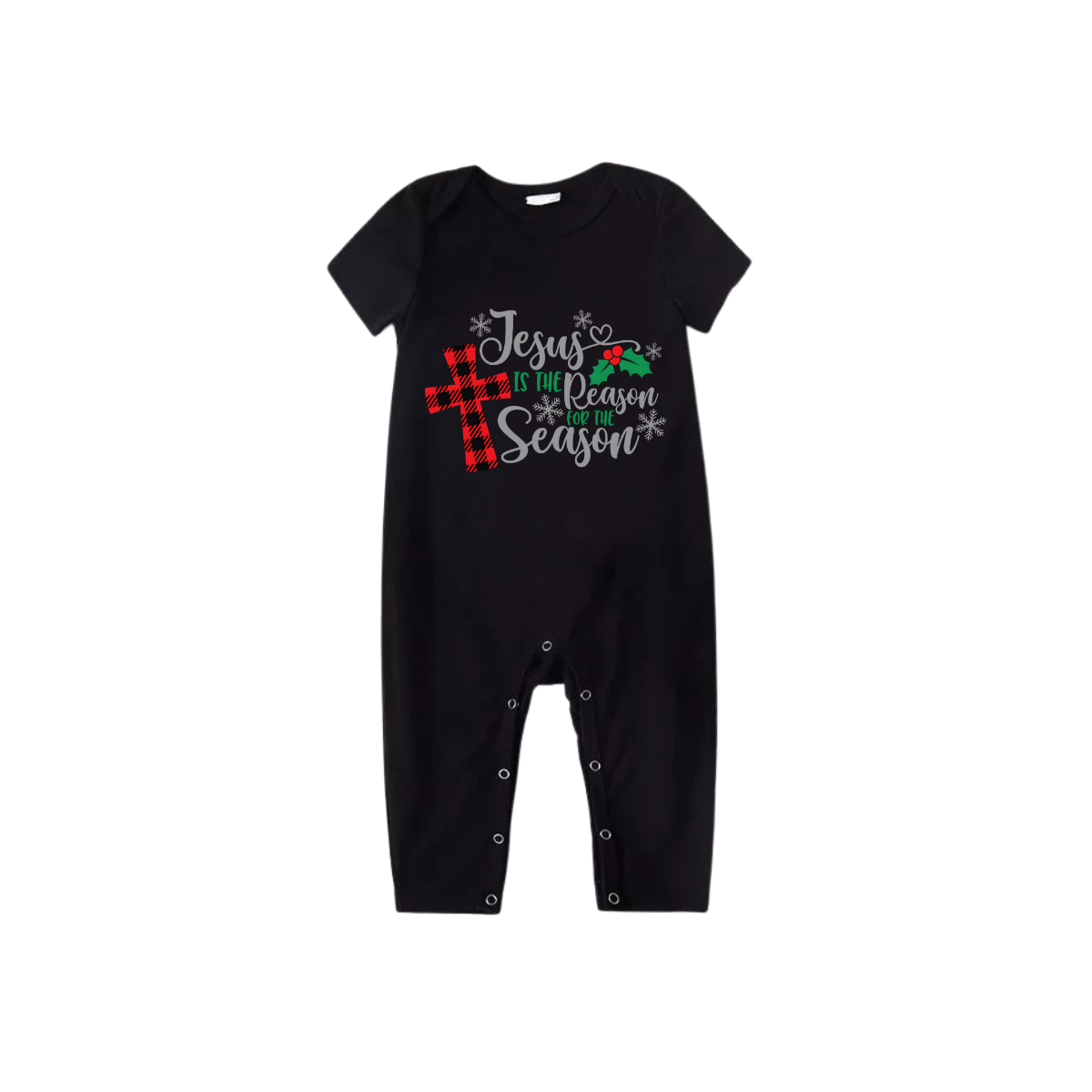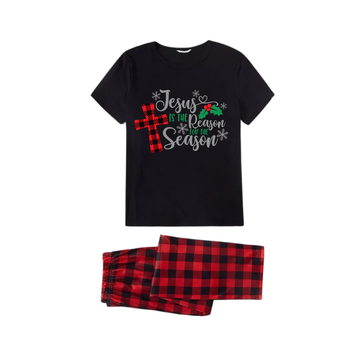 Jesus is the Reason Family Pajamas Set - Black Top Red Pants Red Plaid Sleeves Cross and Snowflake Print