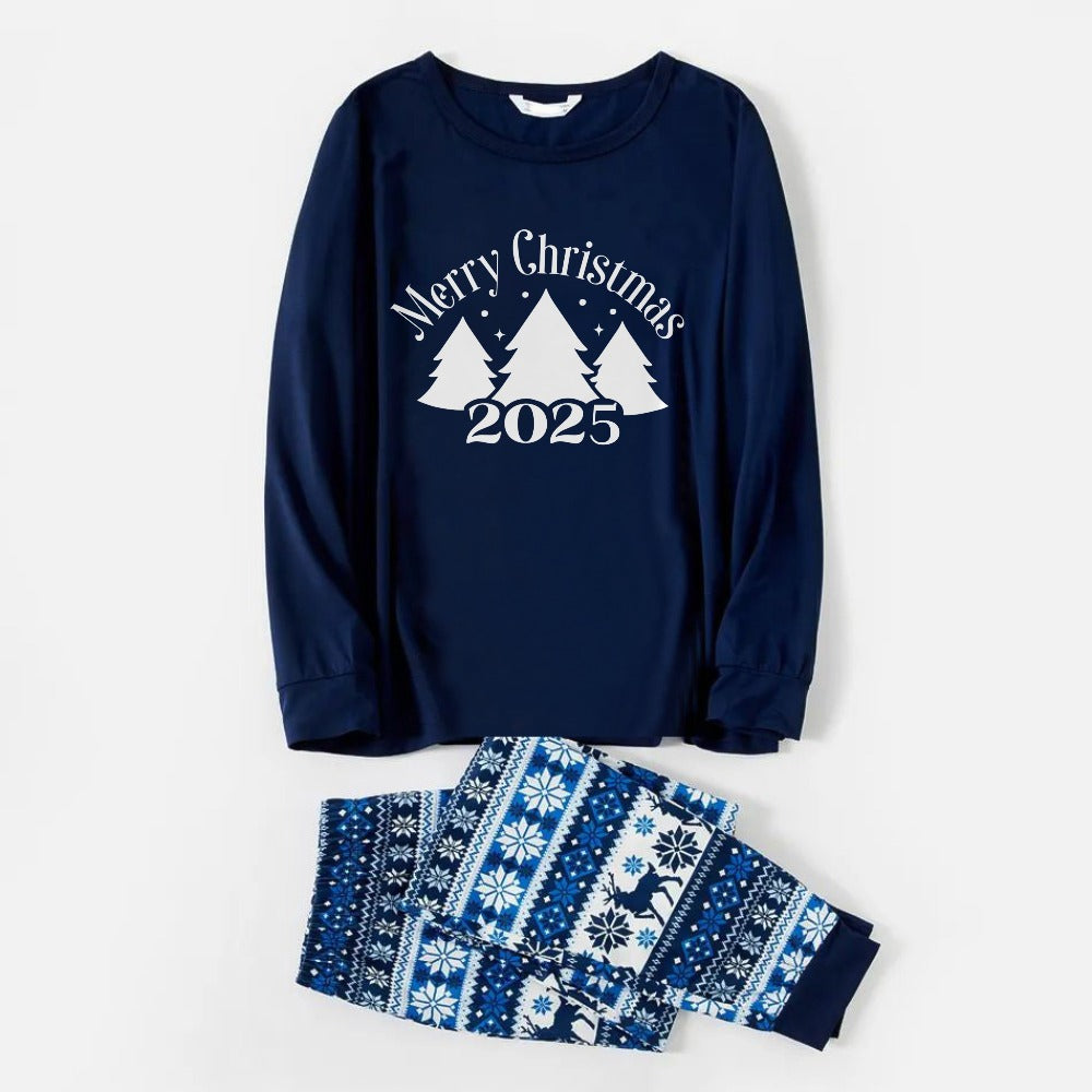 Joyful Blue Christmas Pajamas Set with Christmas Tree and Slogan Designs