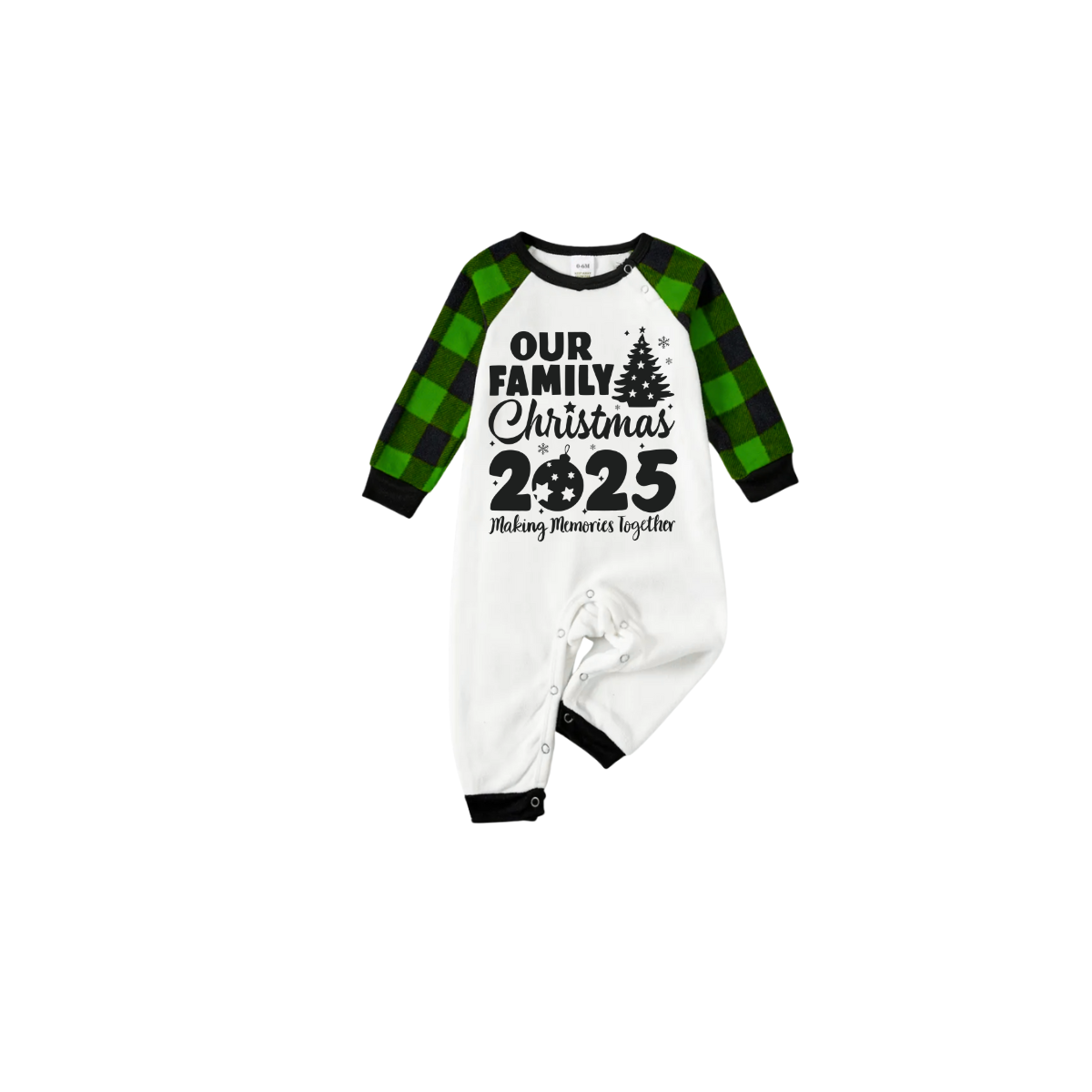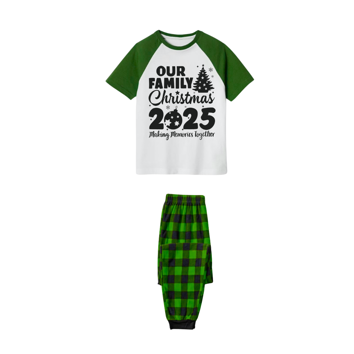 • Our Family Christmas 2025 Family Pajamas Set - White Top, Green Plaid Pants, Green Sleeves, Christmas Tree and Ornaments Print