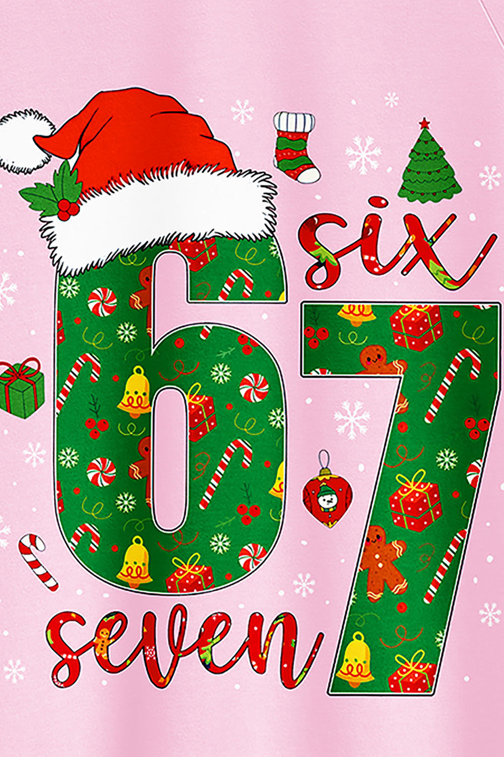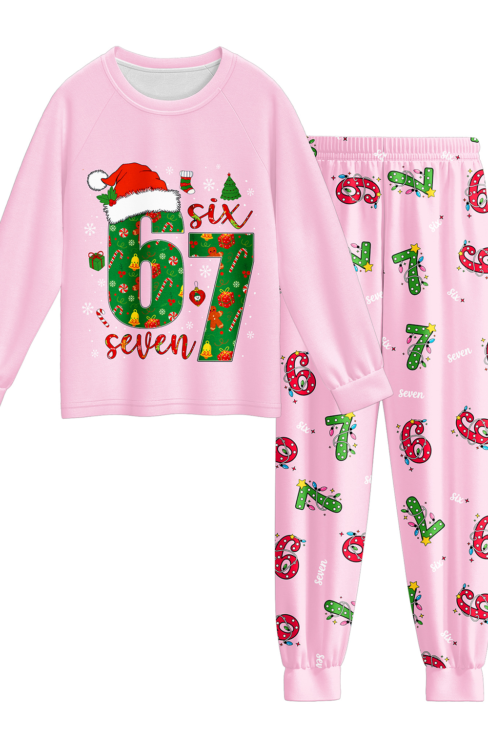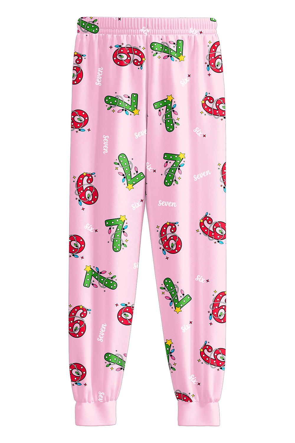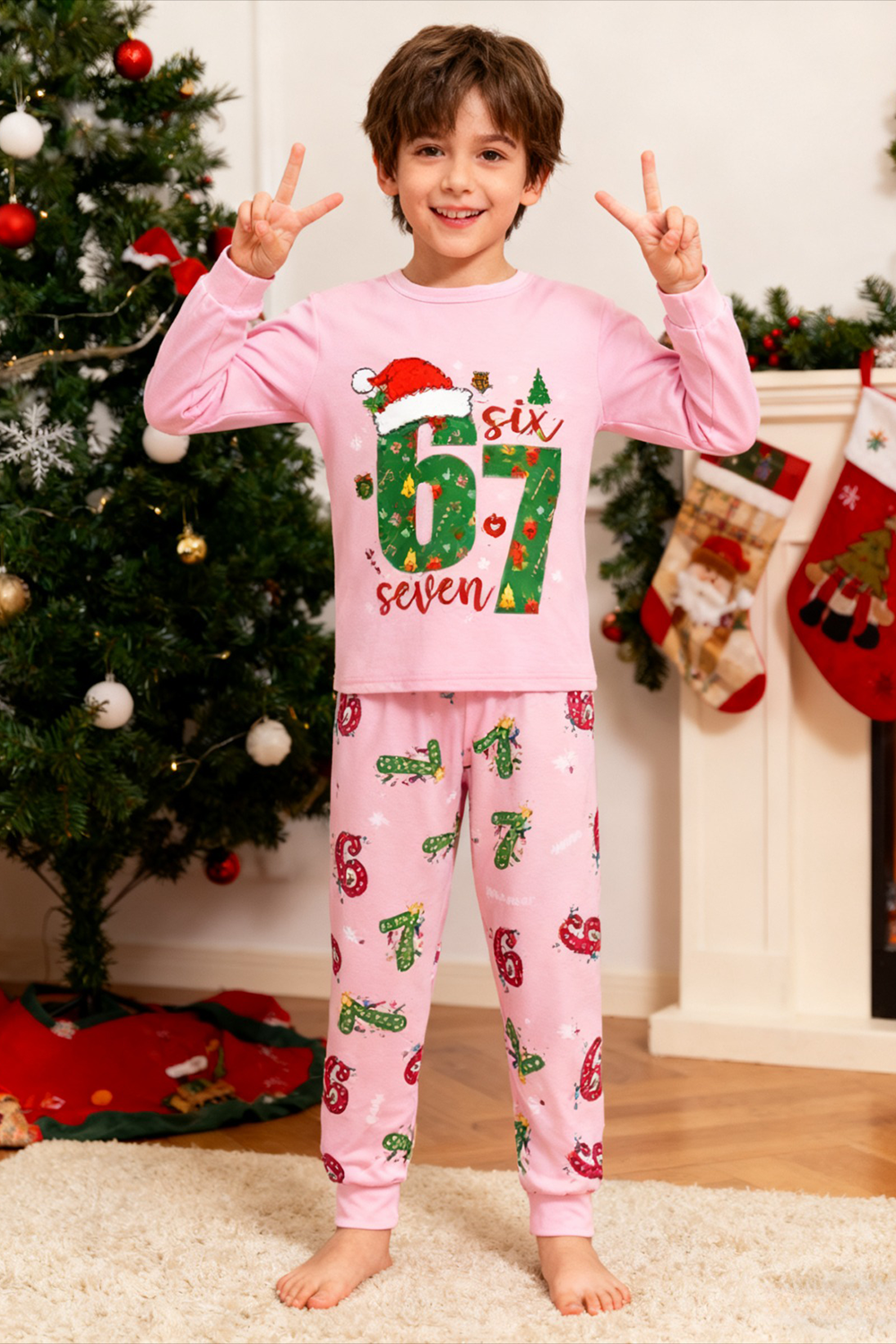 Made from super-soft fabric, this pink two-piece features playful "six" and "7" prints with a tiny Santa hat, plus festive patterns of trees and gifts. Perfect for cozy moments, holiday photos, and making magical memories! These unique SIX SEVEN pajamas make the ultimate holiday gift.