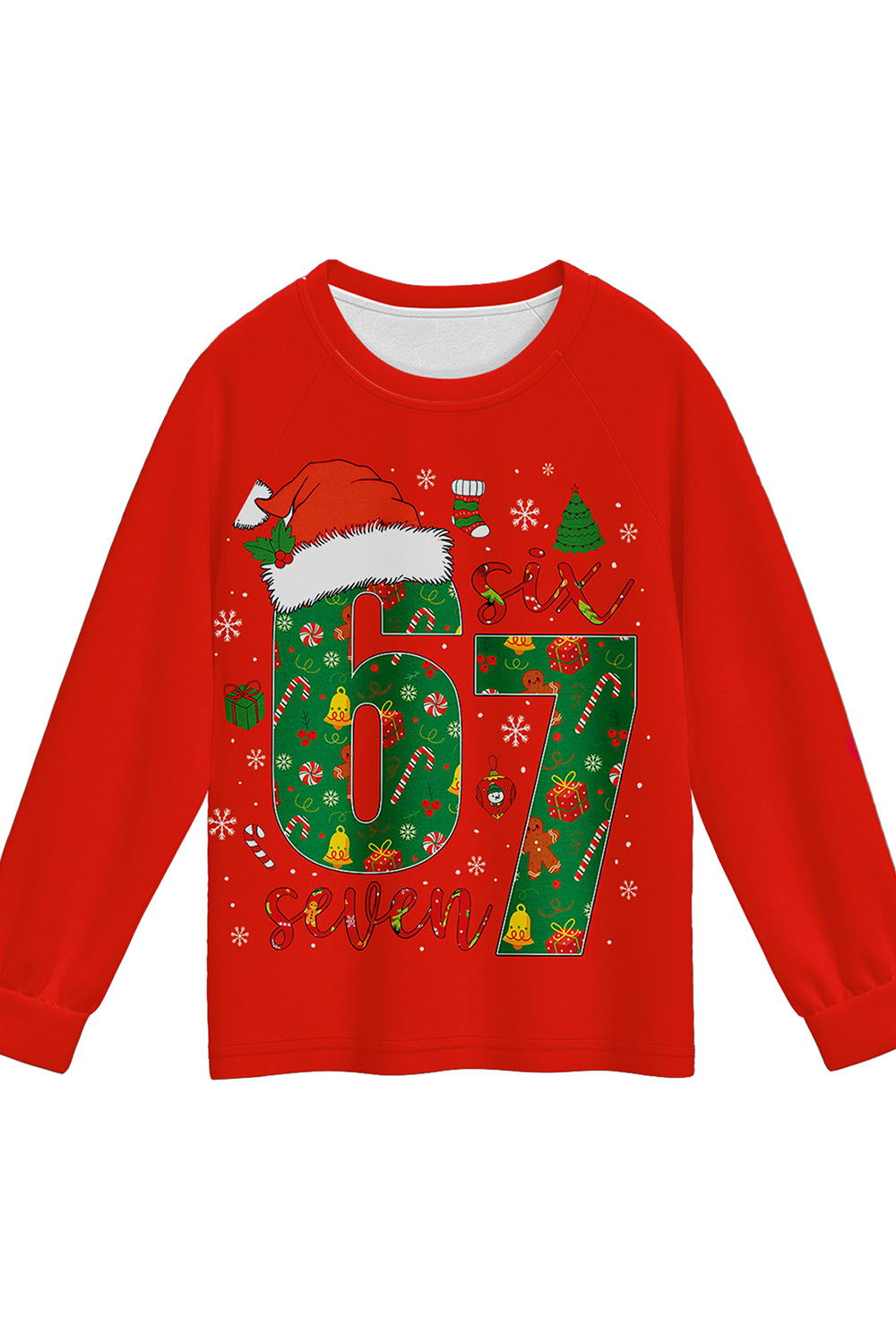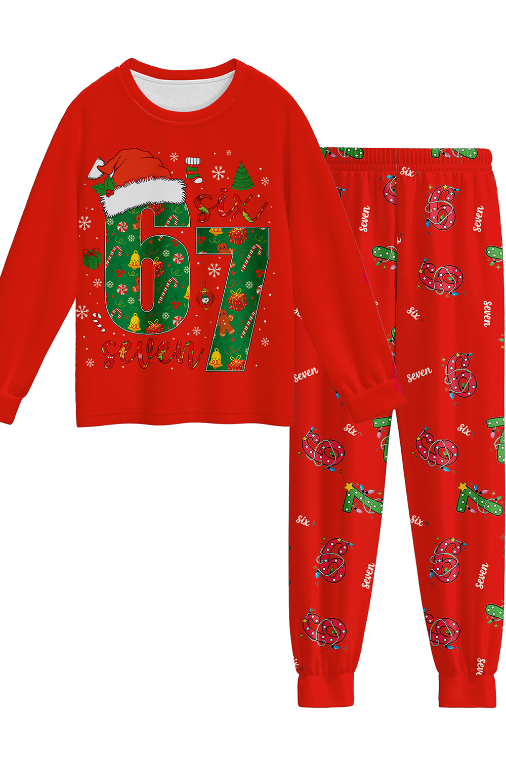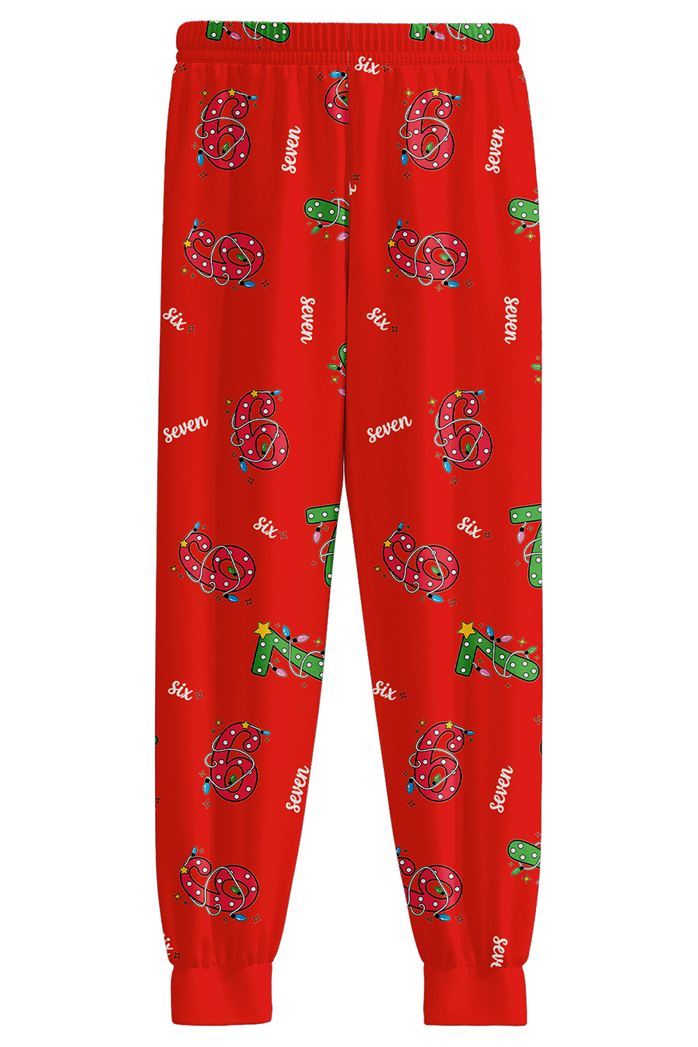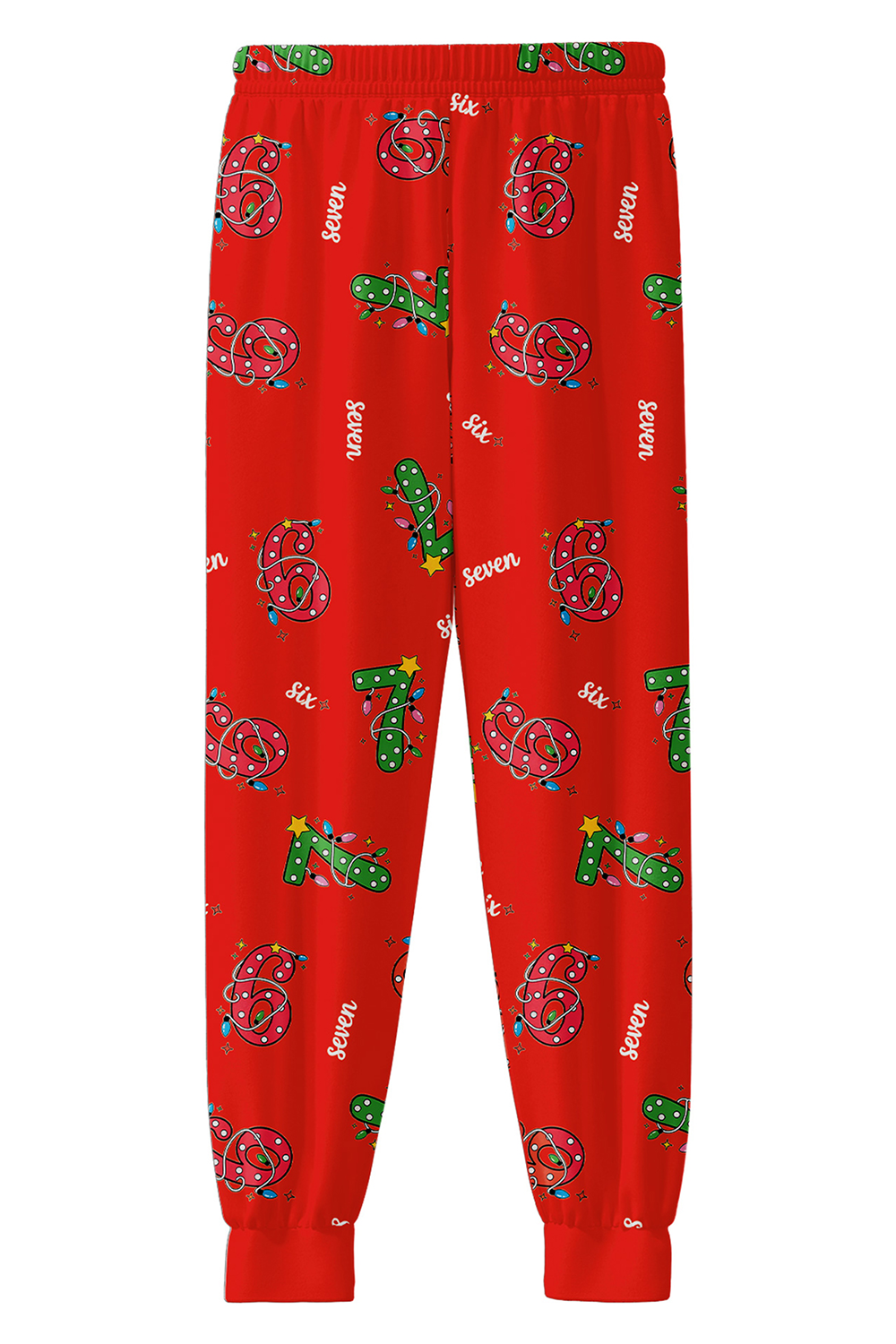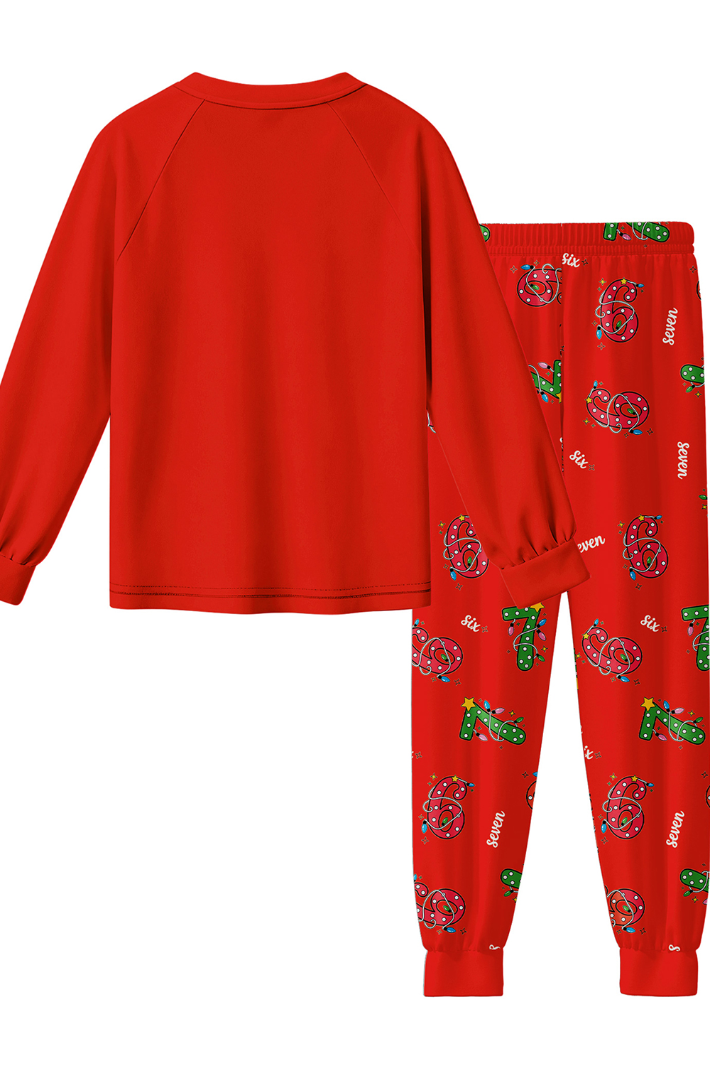 Made from super-soft fabric, this pink two-piece features playful "six" and "7" prints with a tiny Santa hat, plus festive patterns of trees and gifts. Perfect for cozy moments, holiday photos, and making magical memories! These unique SIX SEVEN pajamas make the ultimate holiday gift.