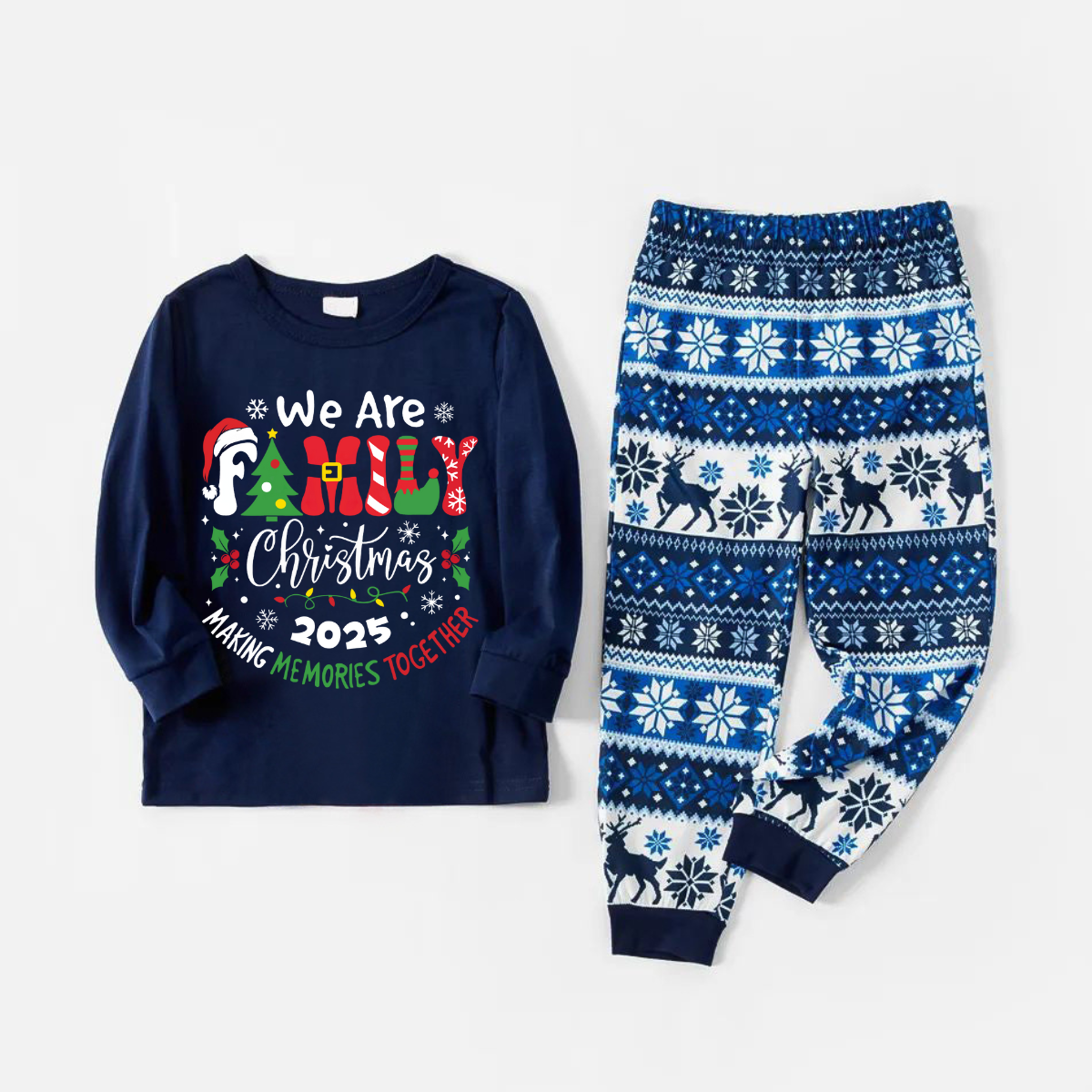 "We are Family 2025 Christmas Make Memories Together" Slogan Print Blue Long Sleeve With Blue Floral Pants Family Matching Pajamas Sets